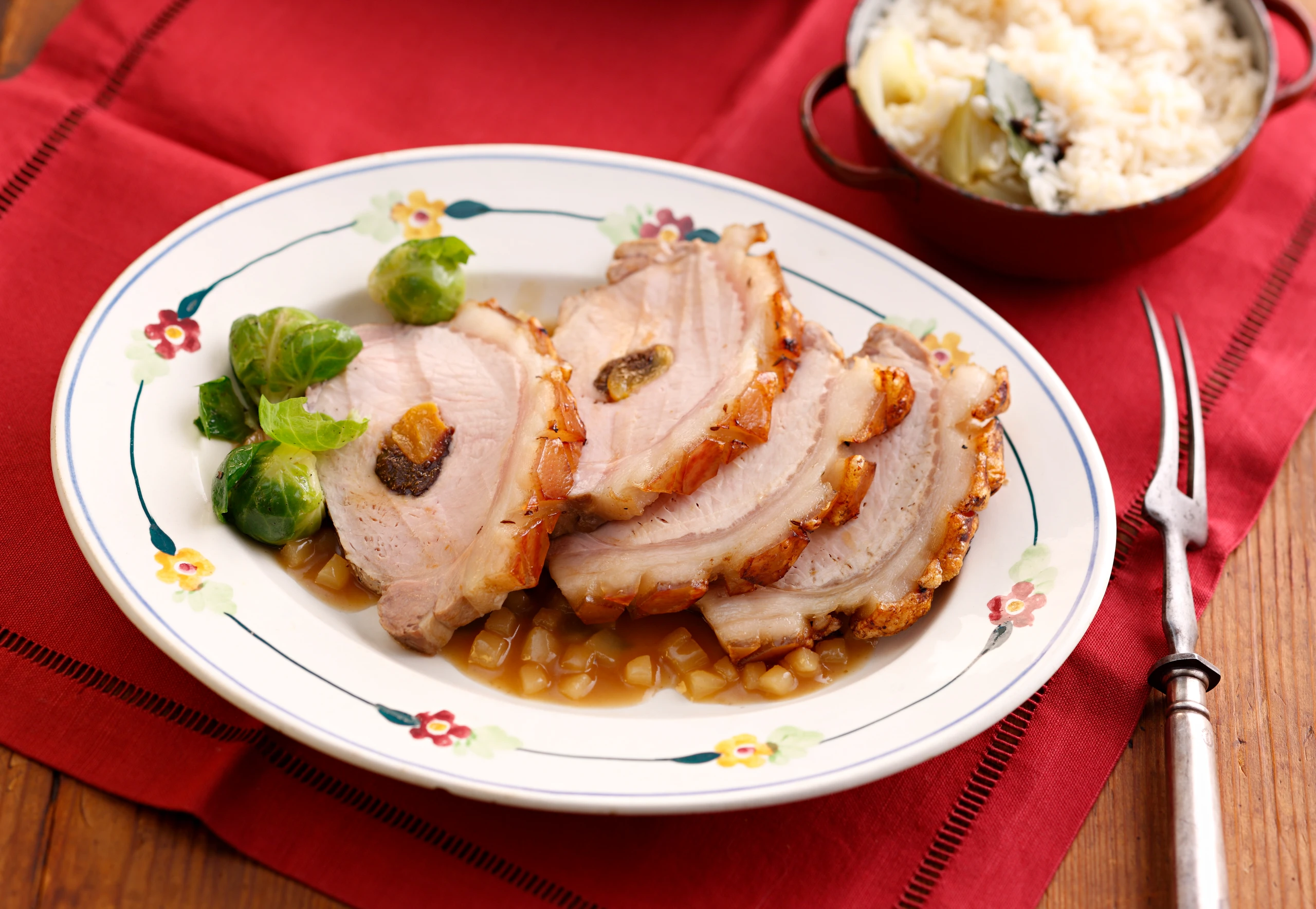 Schweinsbraten mit Dörrobstfülle und Birnensauce