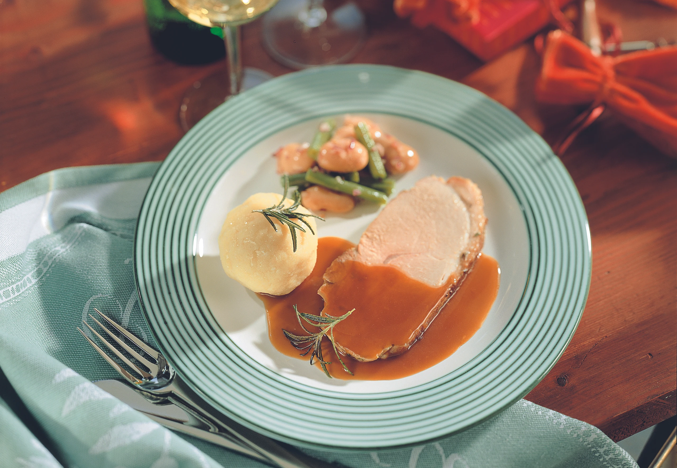 Schweinsbraten mit Rosmarin und dunkler Biersauce, dazu Bohnengemüse und Erdäpfelknödeln