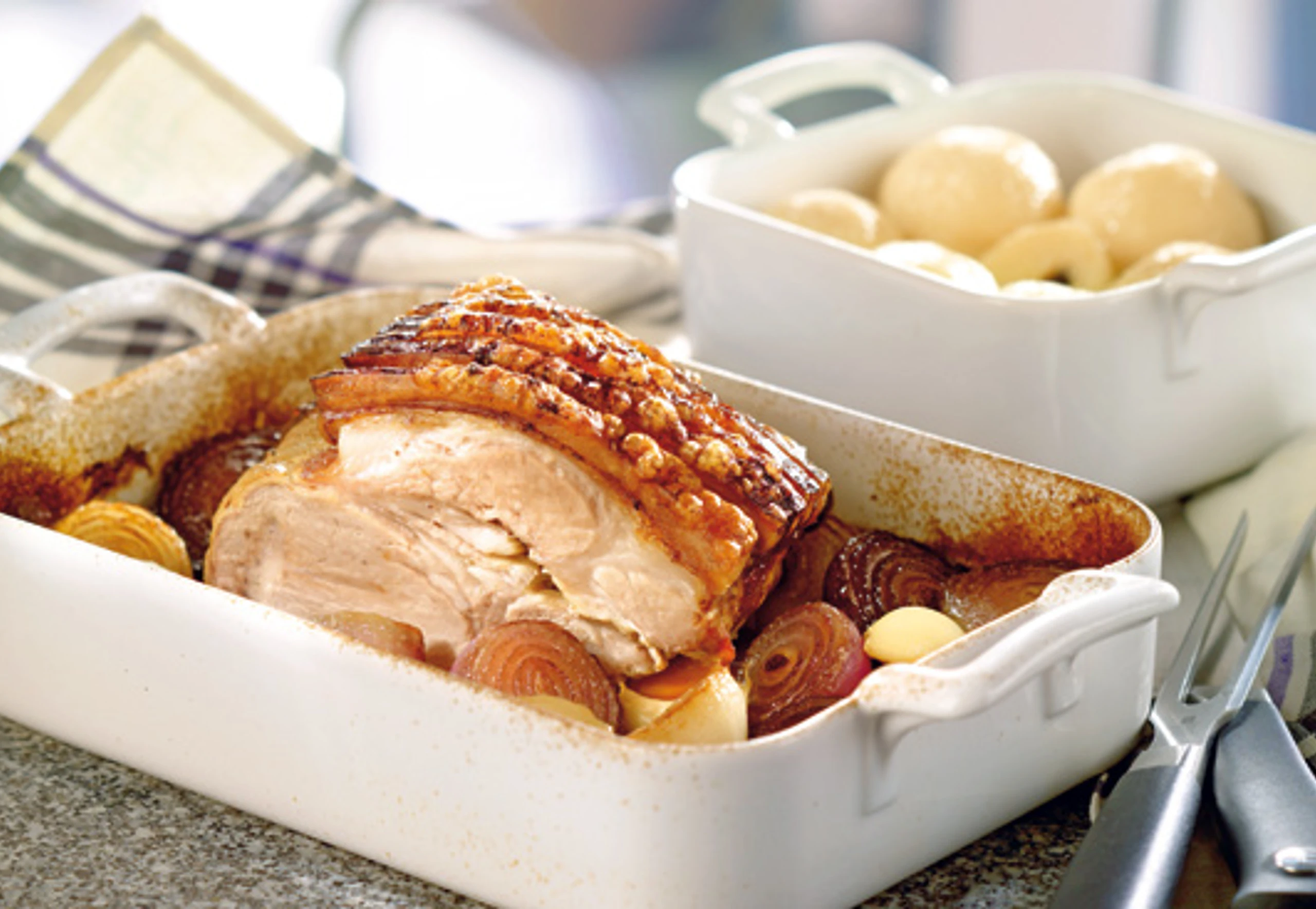 - Braten aus der Pfanne nehmen, zugedeckt rasten lassen, in Scheiben schneiden, mit Zwiebeln und Knödeln anrichten.