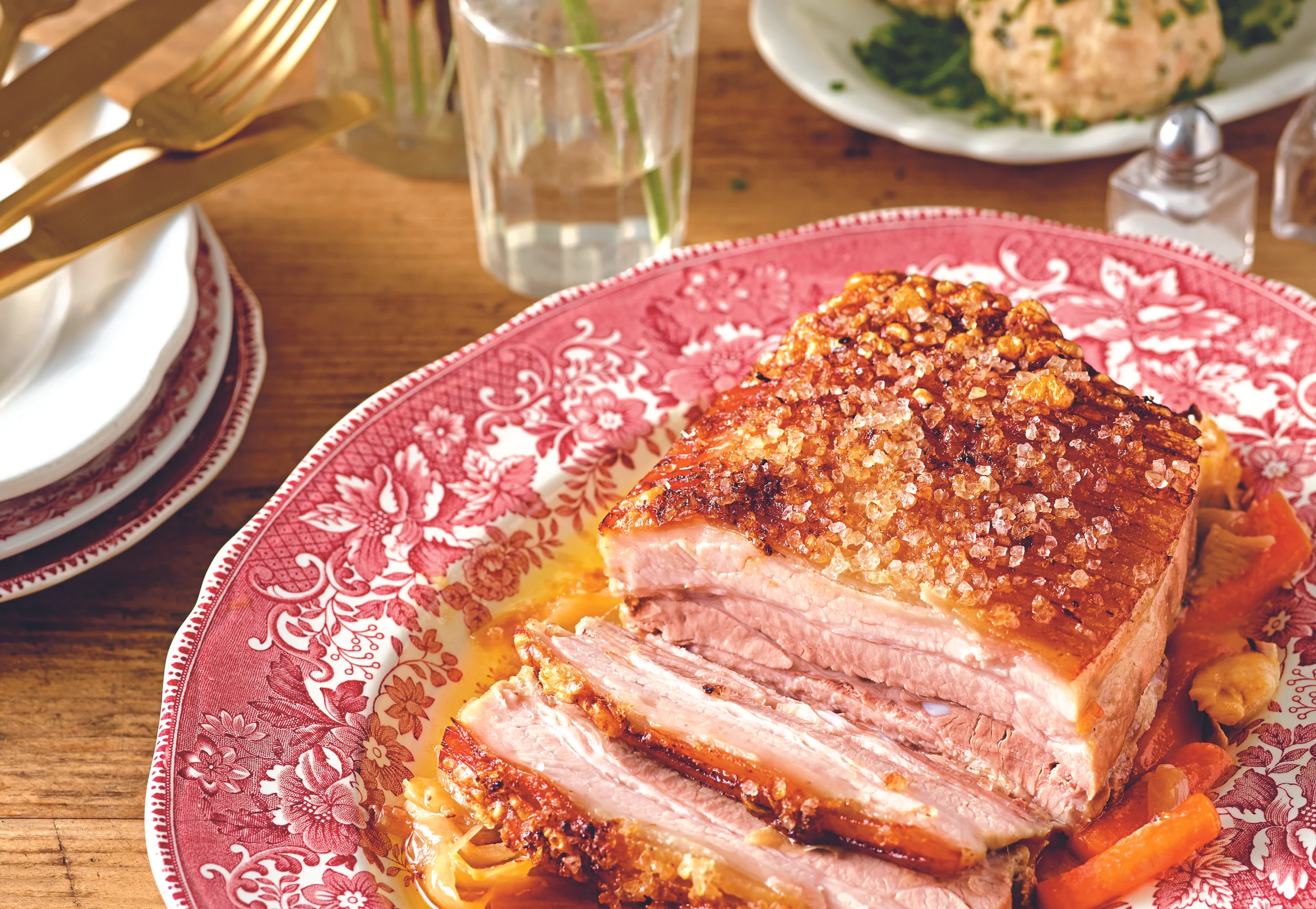 Ca. 10 Minuten vor Ende der Garzeit Rohr auf Grillstufe schalten. Schwarte mit Meersalz bestreuen und knusprig überbacken.