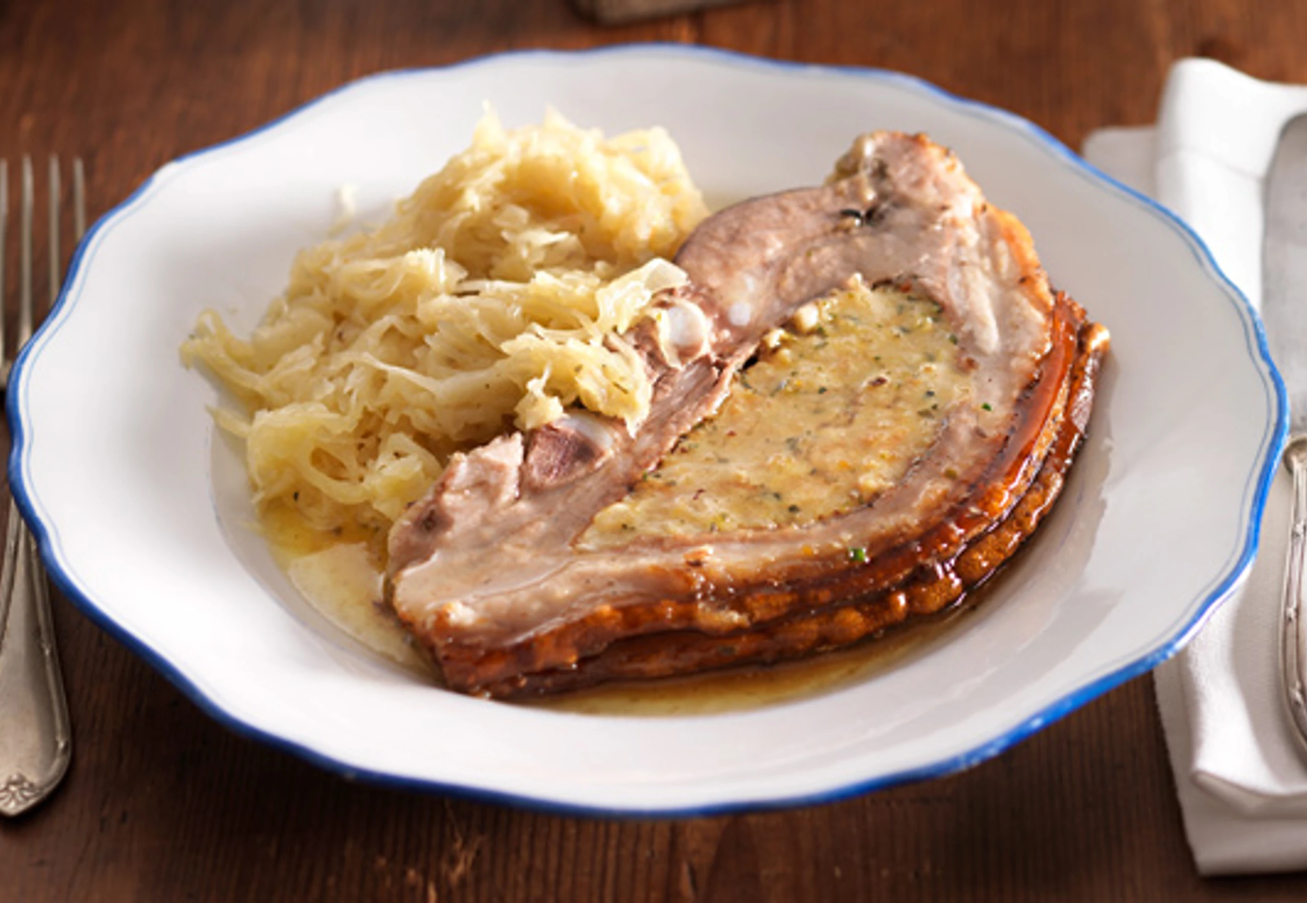 - In einer Pfanne 4 EL Öl erhitzen, Knochen darin rundum anbraten. Fleisch (Schwarte nach oben) darauf setzen. Zwiebel und Wurzelwerk zugeben, Fleisch im Rohr (untere Schiene / Gitterrost) ca. 2 Stunden braten. Nach ca. 15 Minuten Bratzeit mit der Hälfte von 500 ml Suppe untergießen, übrige Suppe nach und nach zugießen.