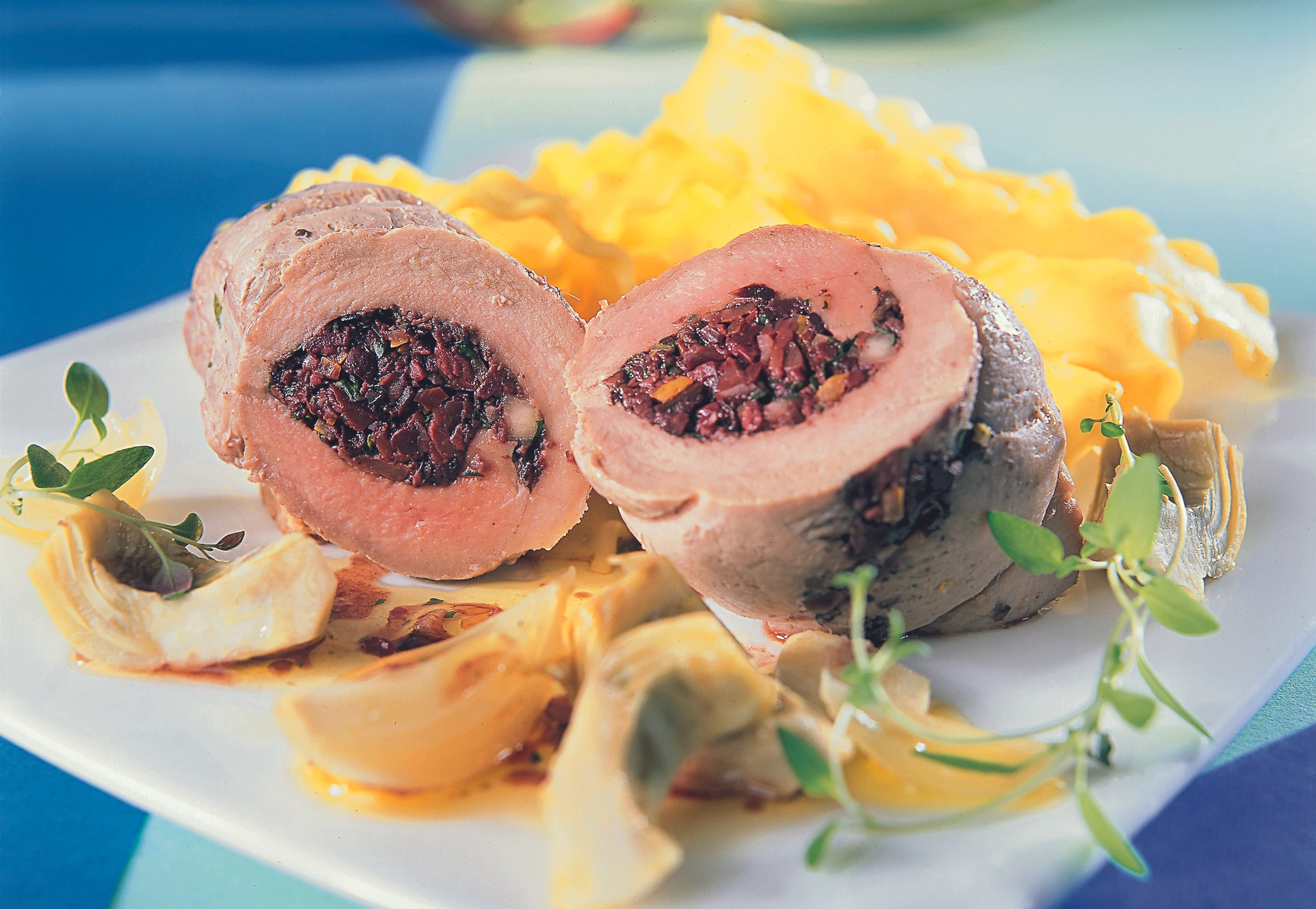 Schweinsfilet mit Artischocken, Oliven und Kräutern
