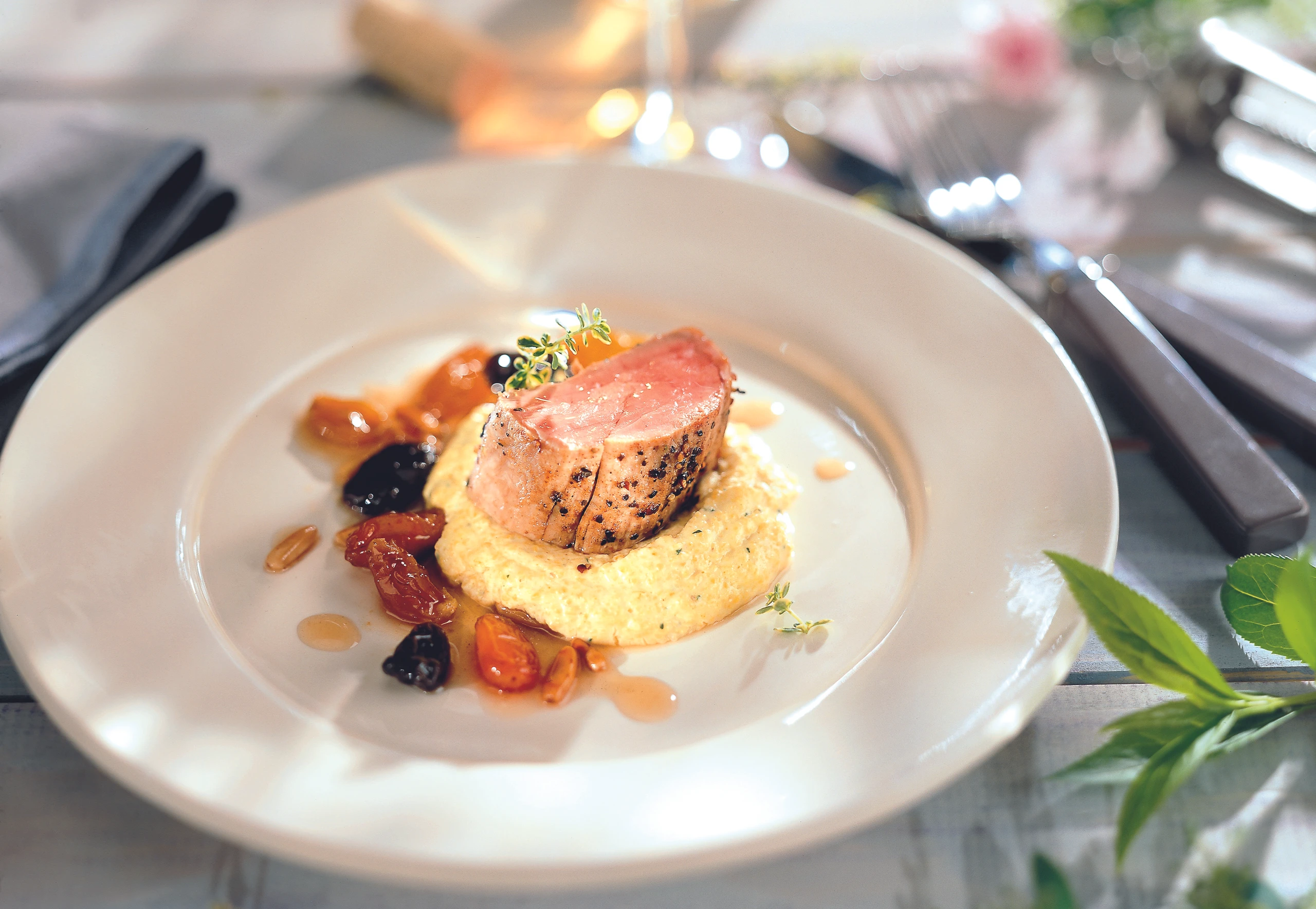 Schweinsfilet mit Grappa-Rosinen-Pignolisauce und cremiger Polenta