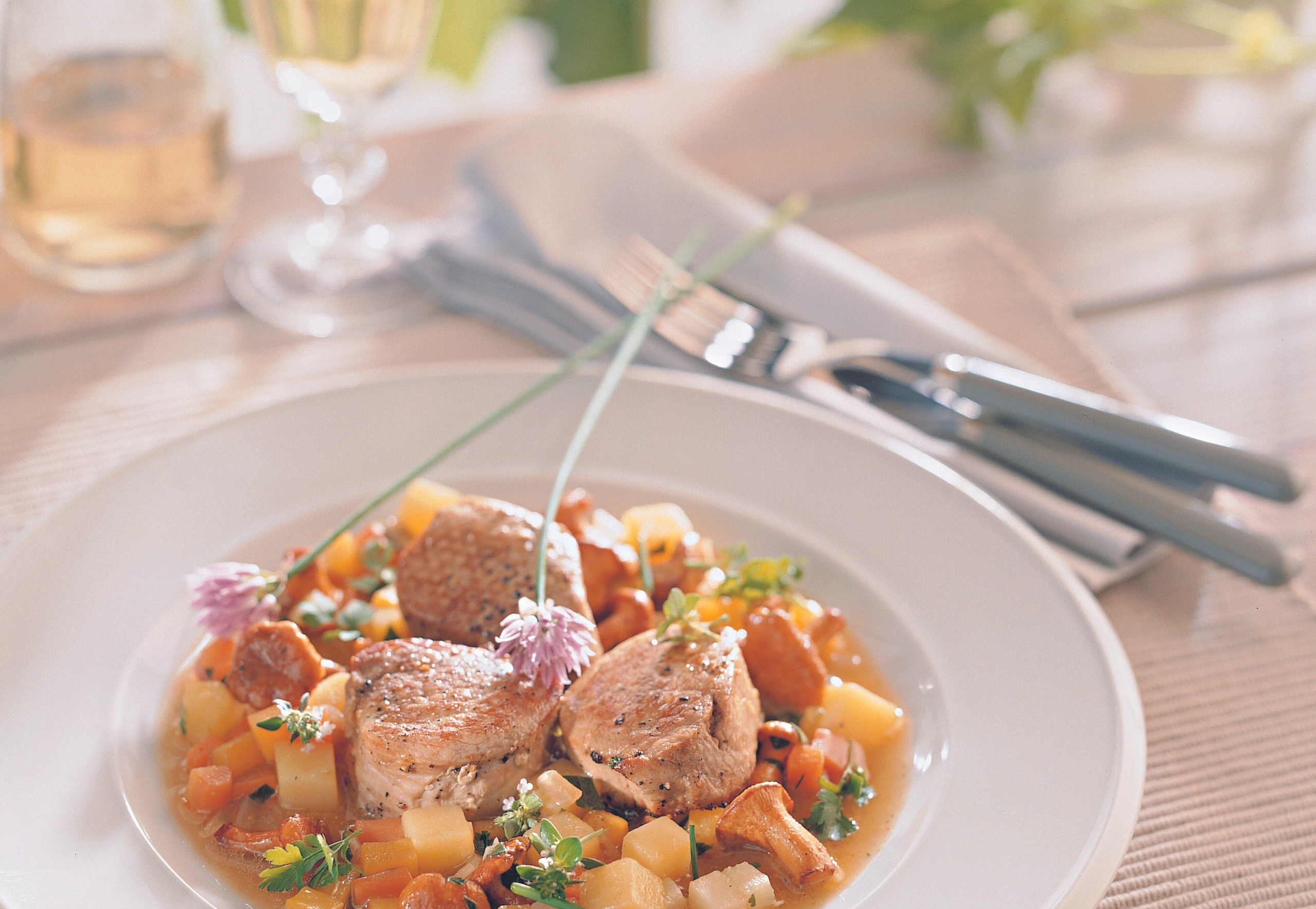 Schweinsfilet im Eierschwammerl-Gemüsefond