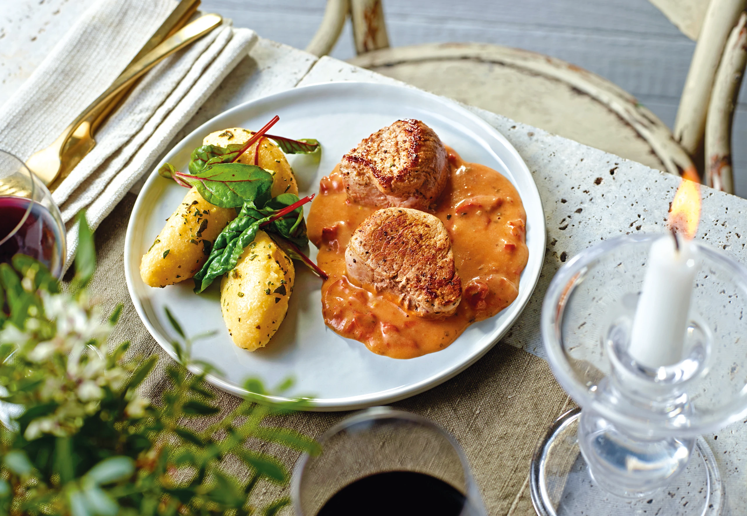 Schweinsfilet mit Käsesauce und Polentanockerln