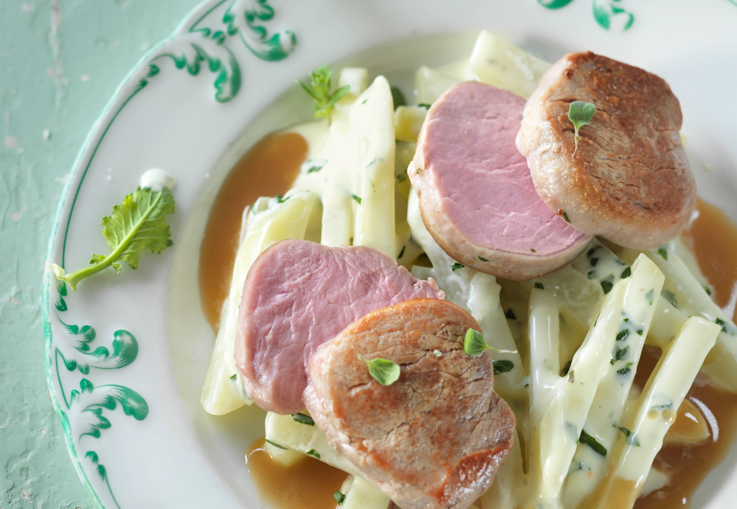 Fleisch in 4 gleich dicke Scheiben (Medaillons) schneiden, ein wenig flach drücken, mit Salz und Pfeffer würzen. Fleisch in Öl beidseitig braten, herausnehmen und warm stellen. Bratrückstand mit Suppe aufgießen und kurz köcheln lassen.