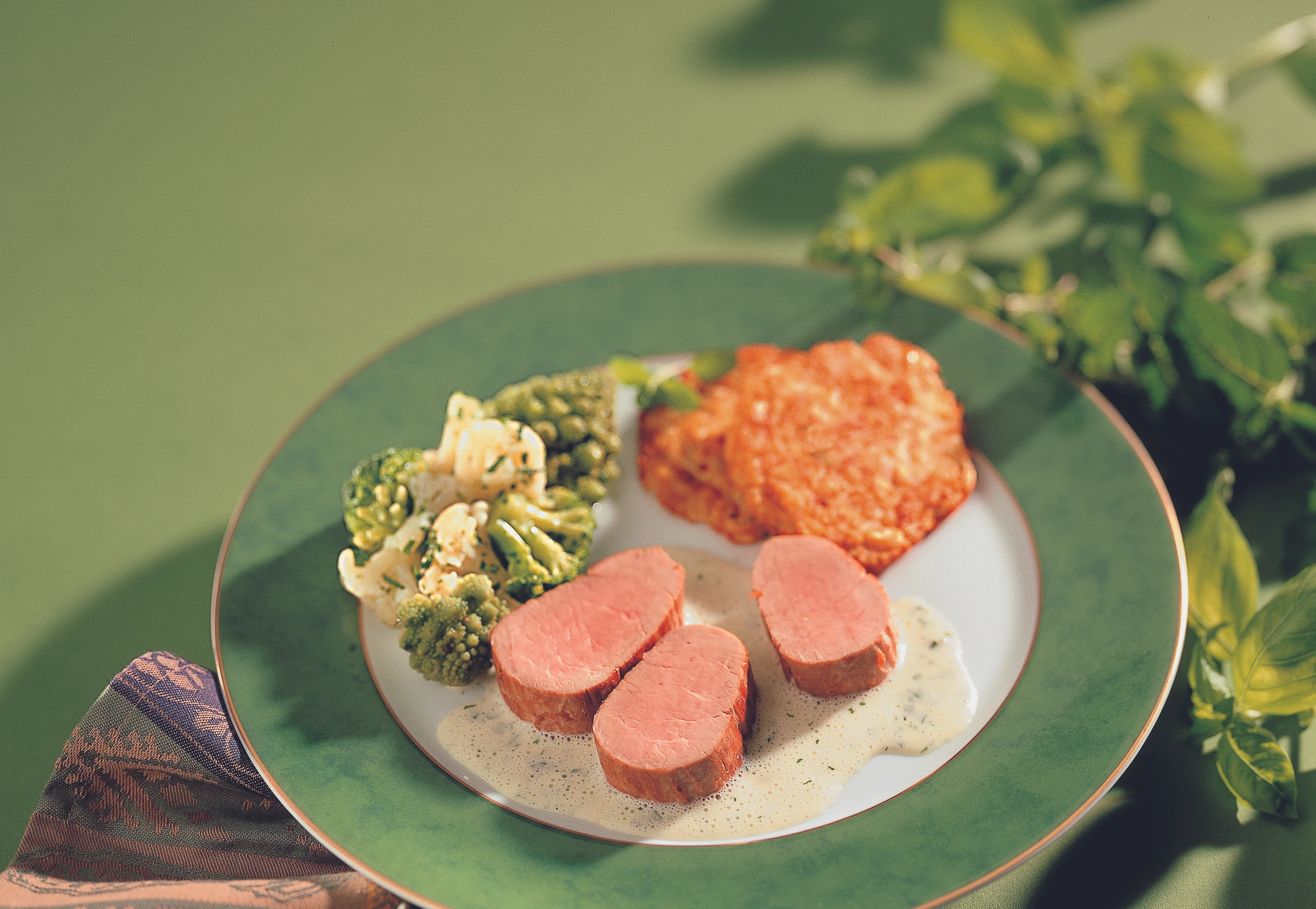 Fleisch in gleich dicke Scheiben schneiden, mit der Sauce anrichten. Dazu passen Erdäpfelrösti und Gemüse.