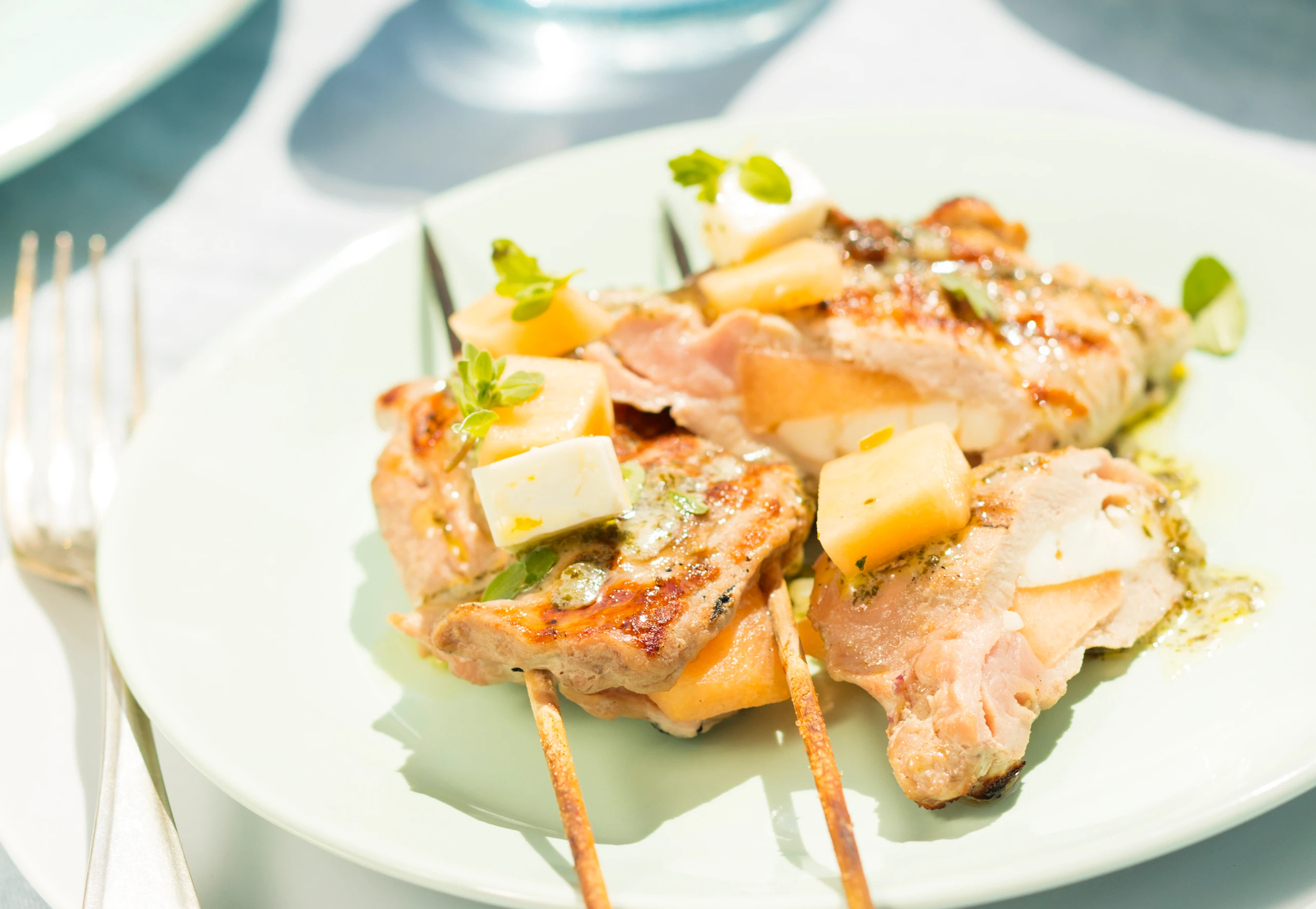 Fleisch in der Mitte mit zwei Dritteln von den Melonen- und Käsestücken belegen und zusammenklappen. Fleisch mit je 2 Holzspießen fixieren.