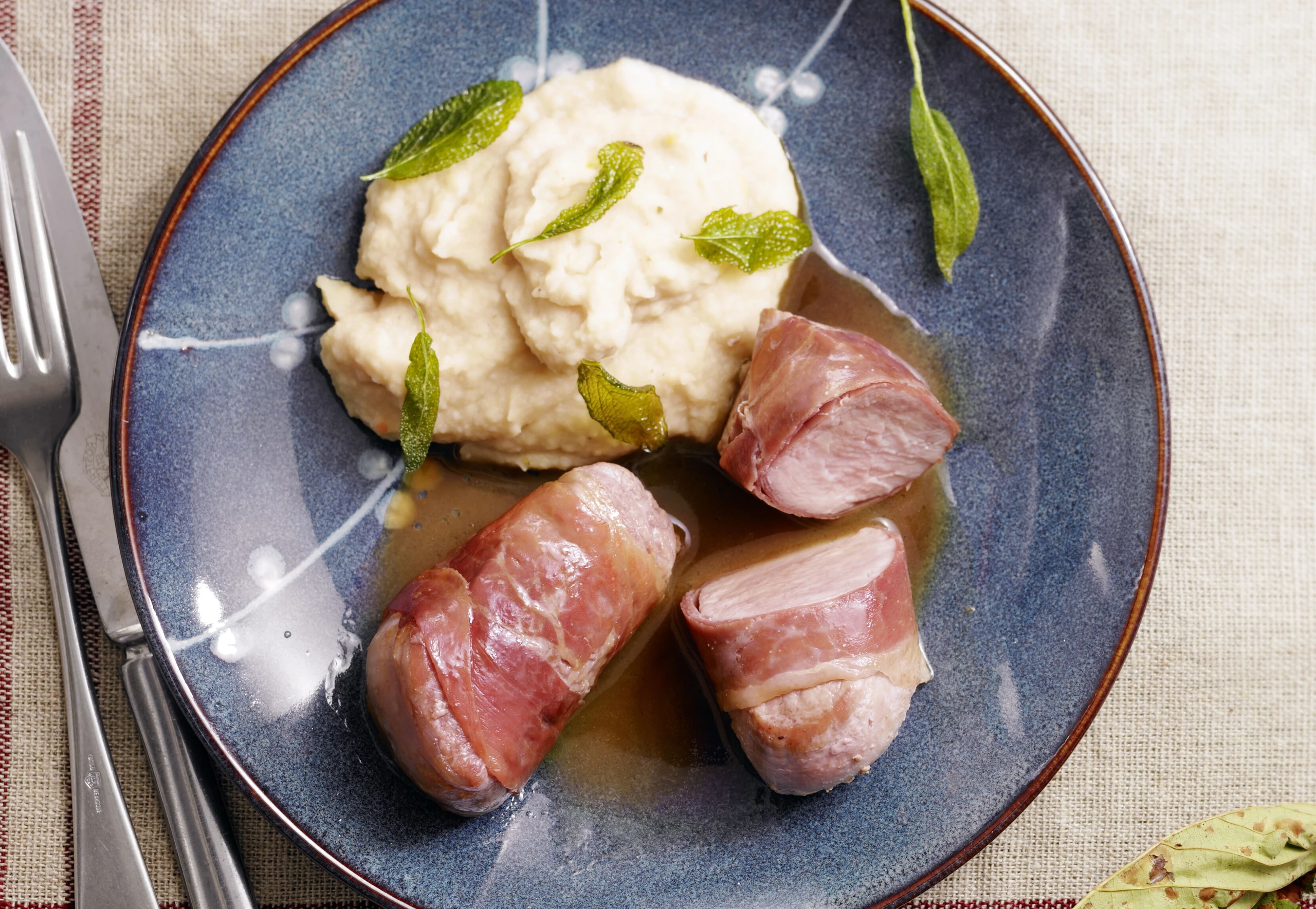 Bratrückstand mit Suppe ablöschen, ca. 1 Minute köcheln und durch Einrühren von 1 EL Butter binden. Parallel dazu Salbeiblätter in wenig Öl knusprig braten, aus der Pfanne nehmen und abtropfen lassen. Filets mit Sauce und Püree anrichten und mit Salbei garniert servieren.
