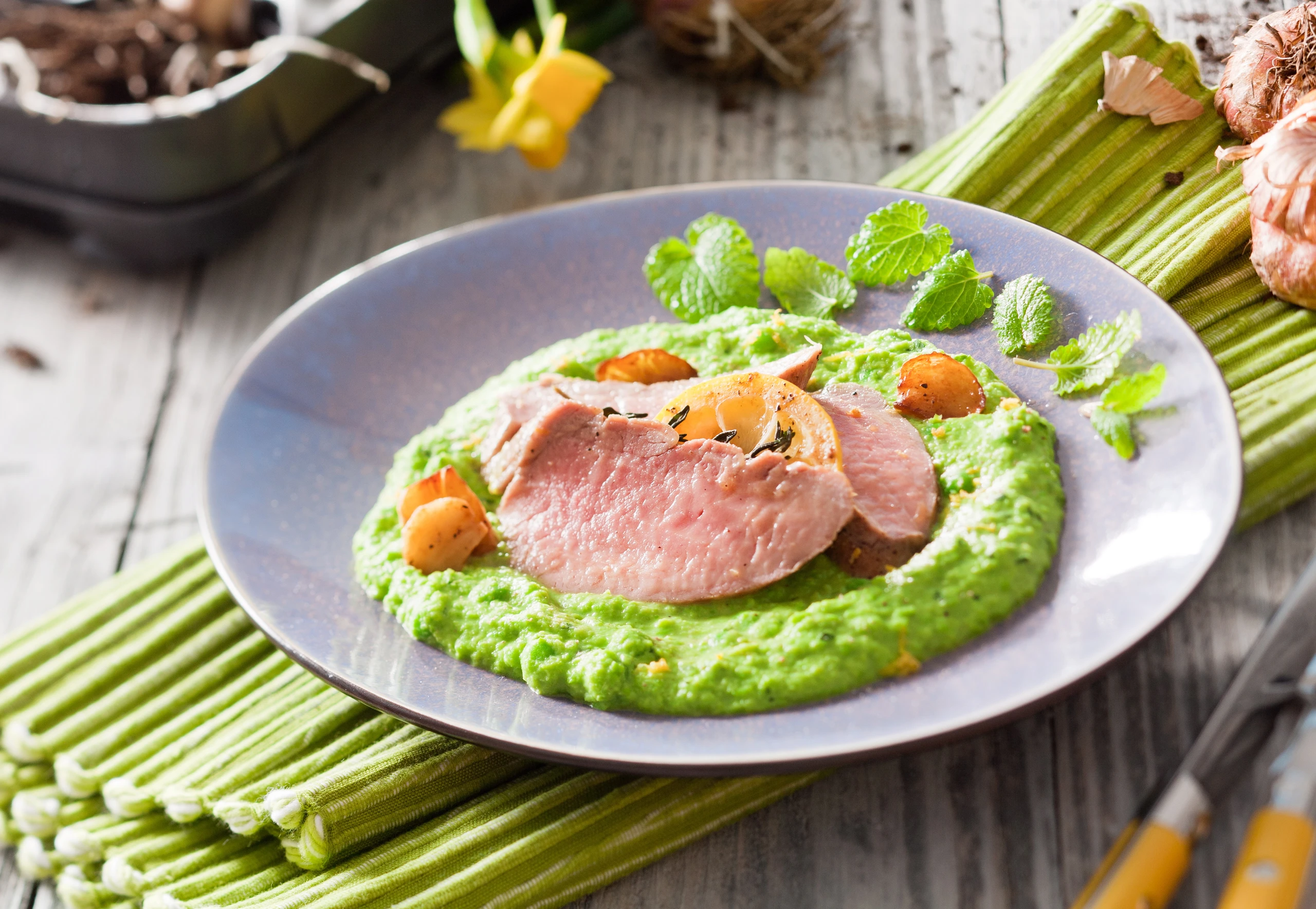 - Püree erwärmen, Fleisch in schräge Scheiben schneiden, mit Zitronen, Knoblauch, Thymian und eventuell Minzeblättern garniert servieren.
