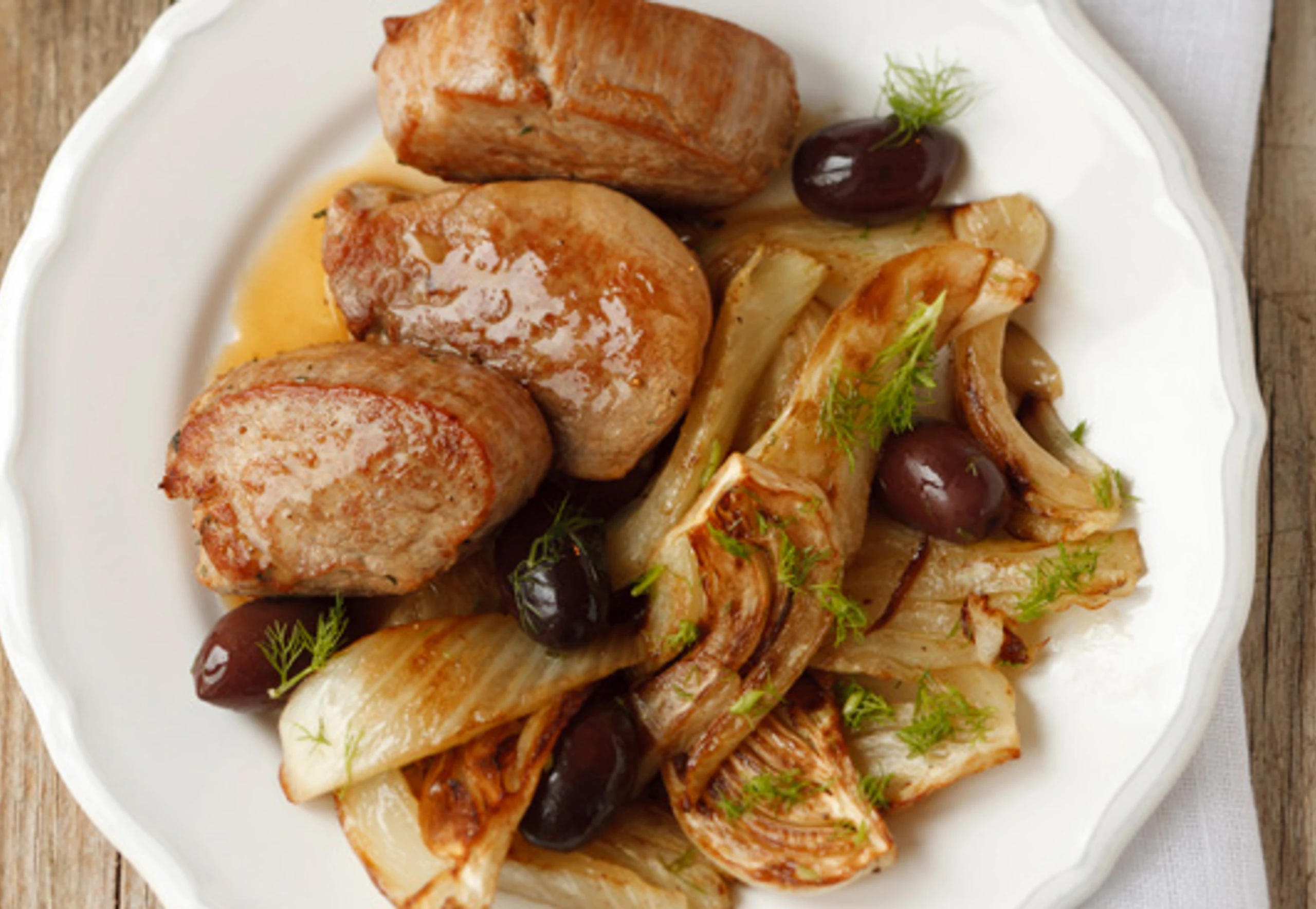 In einer zweiten Pfanne Fenchel in 2 EL Öl beidseitig bissfest braten (dauert ca. 4 Minuten), mit Salz und Pfeffer würzen. Oliven und Fenchelgrün unterrühren. Fleisch mit Gemüse und Bratensaft anrichten.