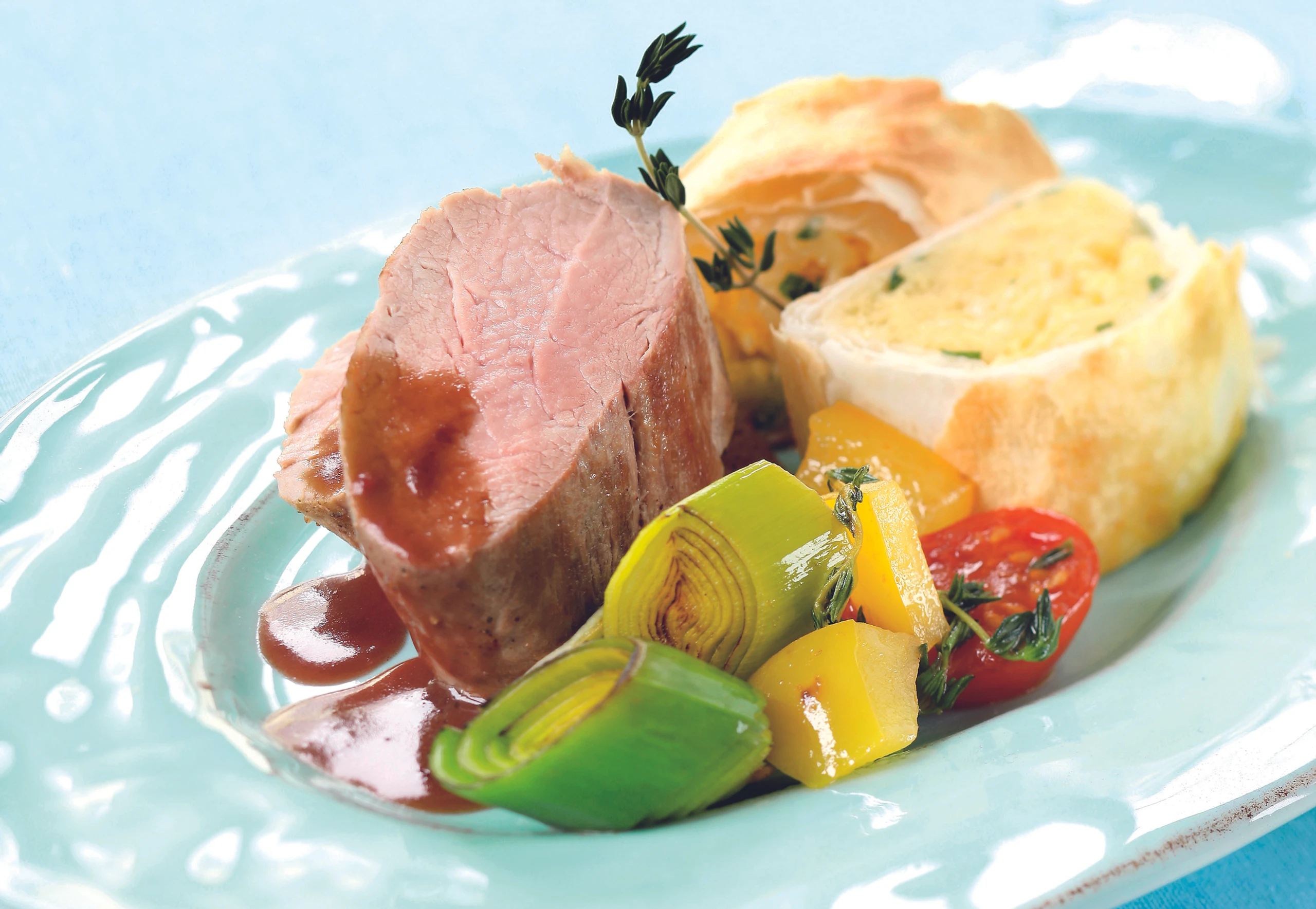 Schweinsfilet mit Gemüse und Erdäpfel Strudel