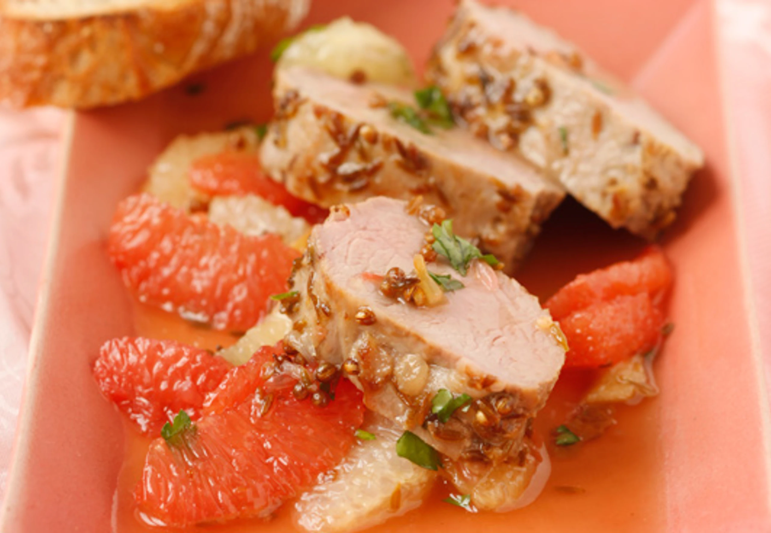 - Fleisch portionieren, mit Saft und Grapefruitfilets anrichten und mit Petersilie bestreut servieren. Dazu passt getoastetes Baguette.