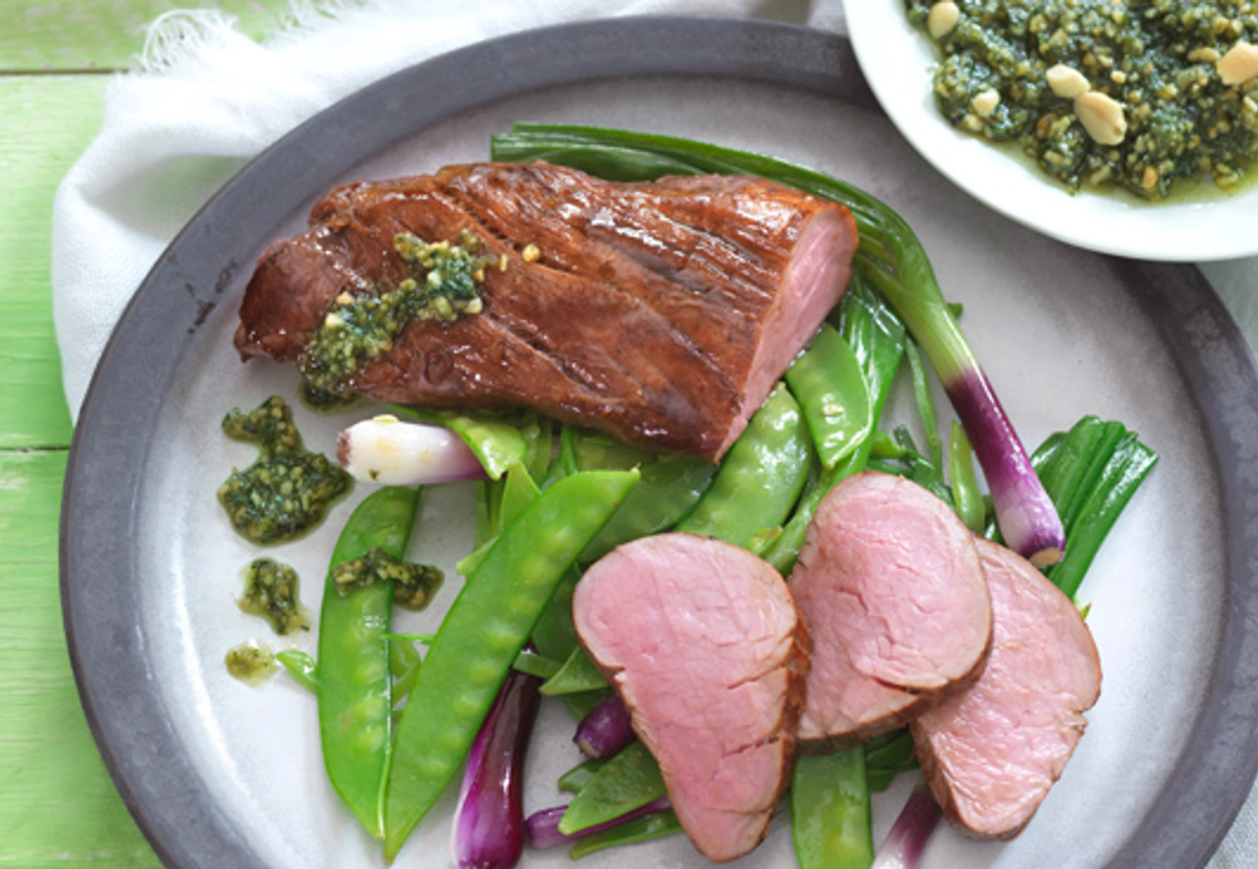 - Fleisch aus dem Rohr nehmen und ca. 5 Minuten rasten lassen. Marinade erhitzen und das Filet kurz darin wenden. Filet in dünne Scheiben schneiden, mit Gemüse und dem Pesto servieren.