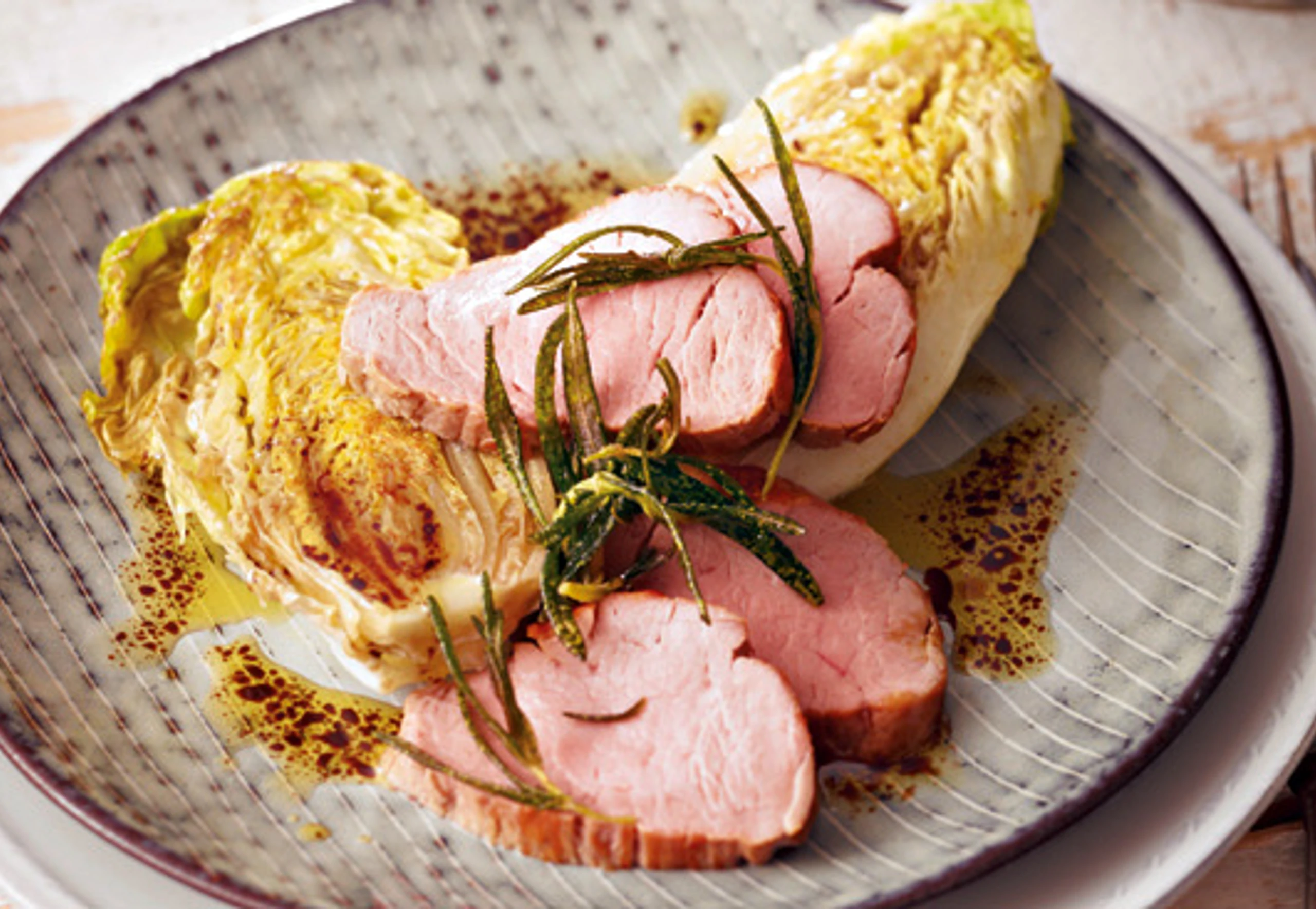 Rohr auf 75°C vorheizen. Schweinsfilet salzen und pfeffern. In einer Pfanne 2 EL Öl erhitzen, Fleisch darin bei mittlerer Hitze 12?15 Minuten rosa braten, dabei immer wieder wenden. Gegen Ende der Garzeit 1 EL Olivenöl und Rosmarin zugeben, Rosmarin knusprig braten.
