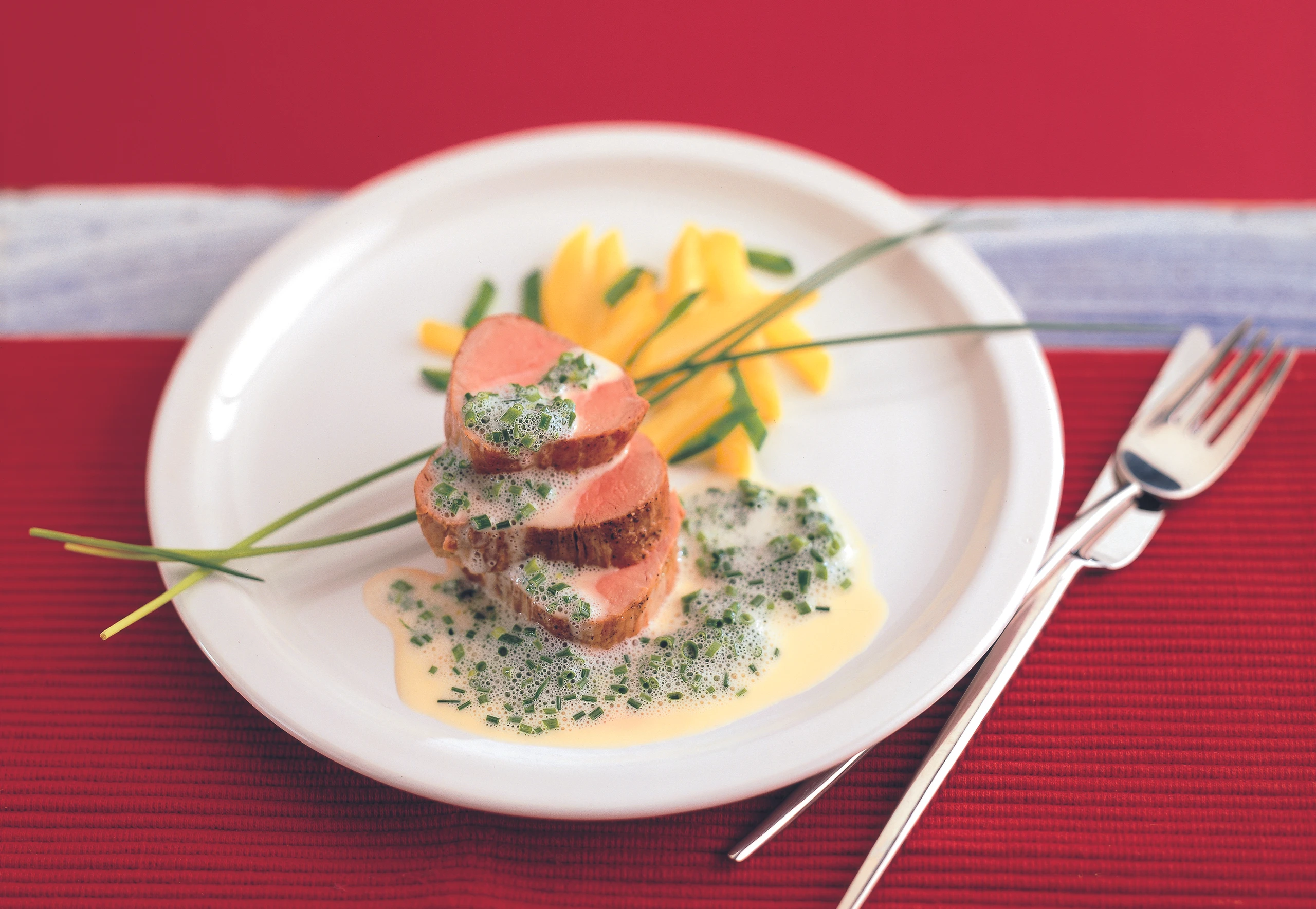 - Bratfett abgießen. Bratrückstand mit Suppe ablöschen und auf ca. 250 ml einkochen. Butterstücke nach und nach unter Rühren zur Sauce geben. Sauce erhitzen, aber nicht mehr kochen. Schnittlauch fein schneiden und in die Sauce rühren. Filet in Scheiben schneiden und mit dem Fond anrichten. Als Beilage passen Erdäpfel.