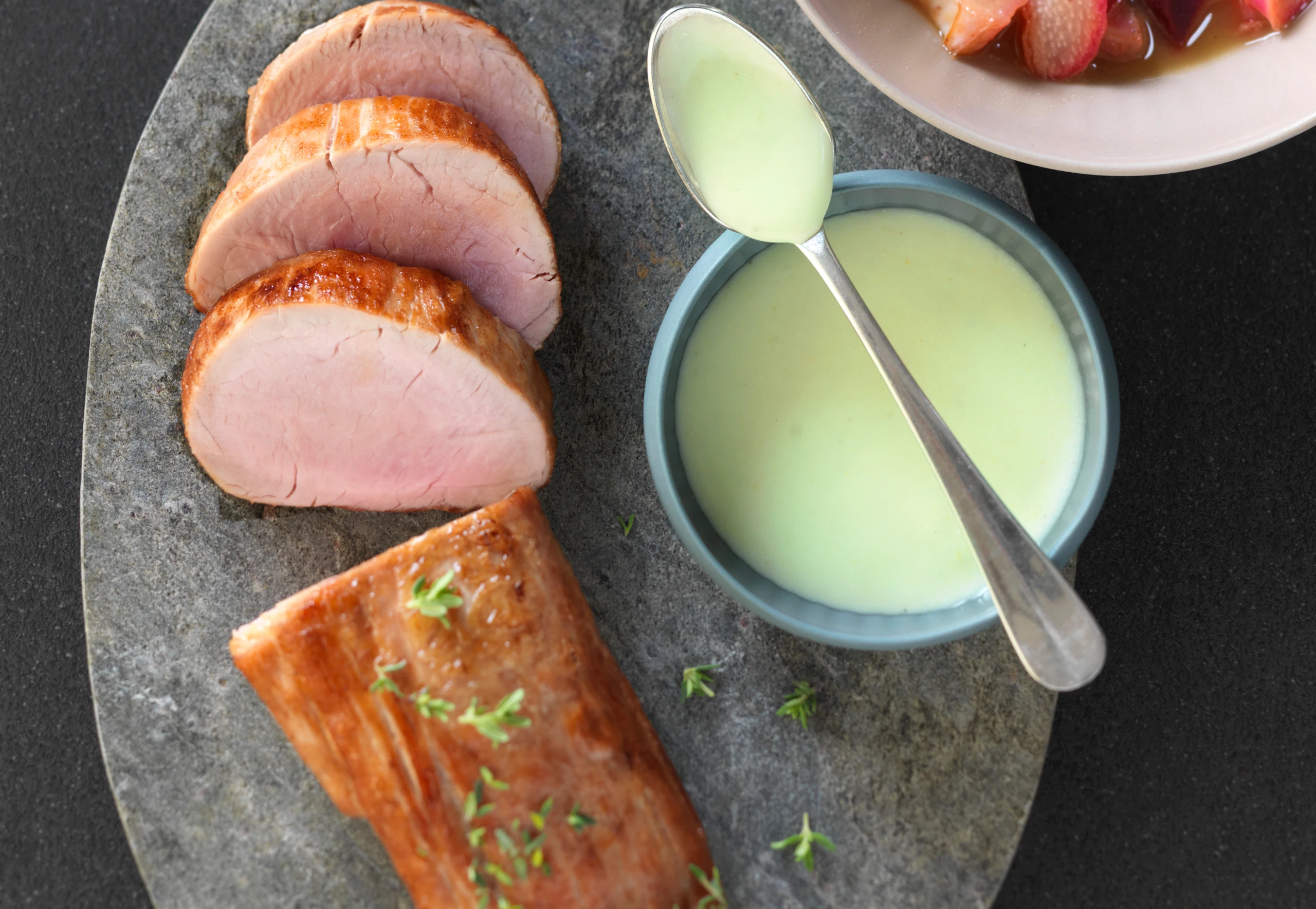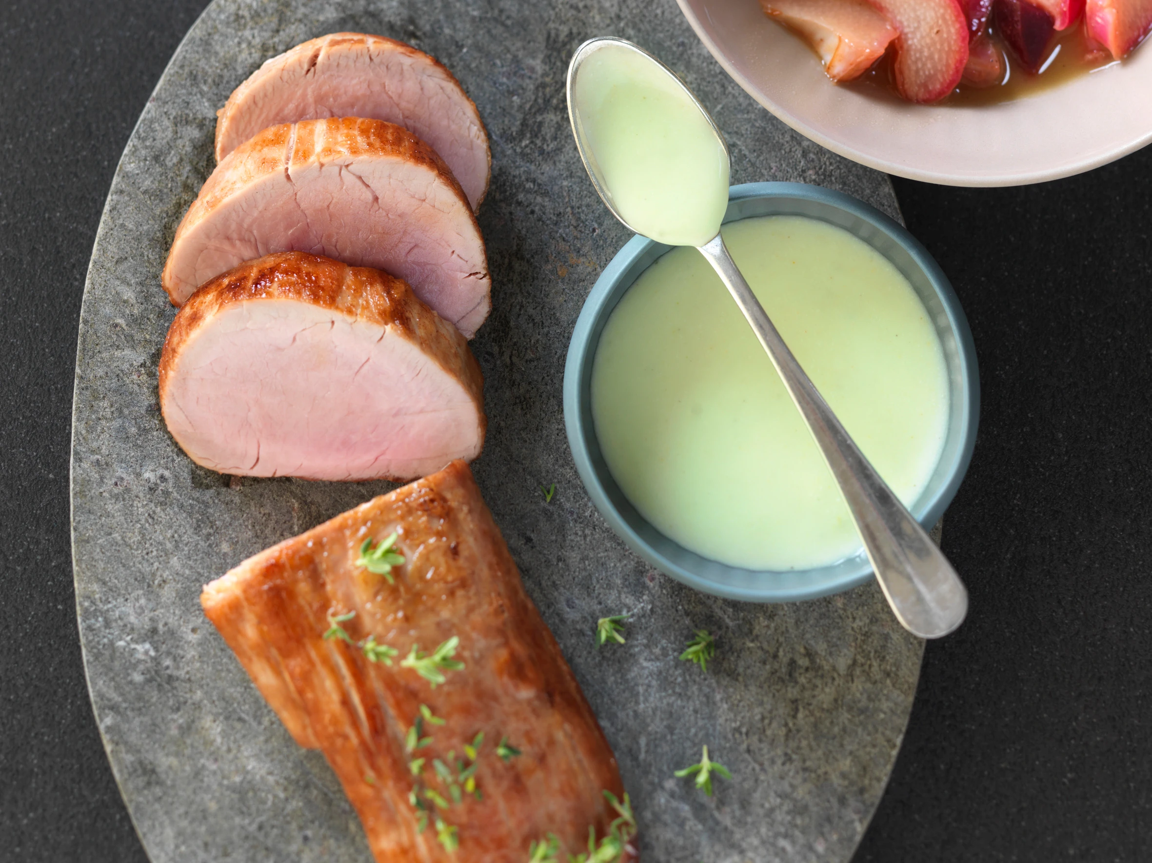 Schweinsfilet mit Rhabarber, roten Rüben und Wasabicreme