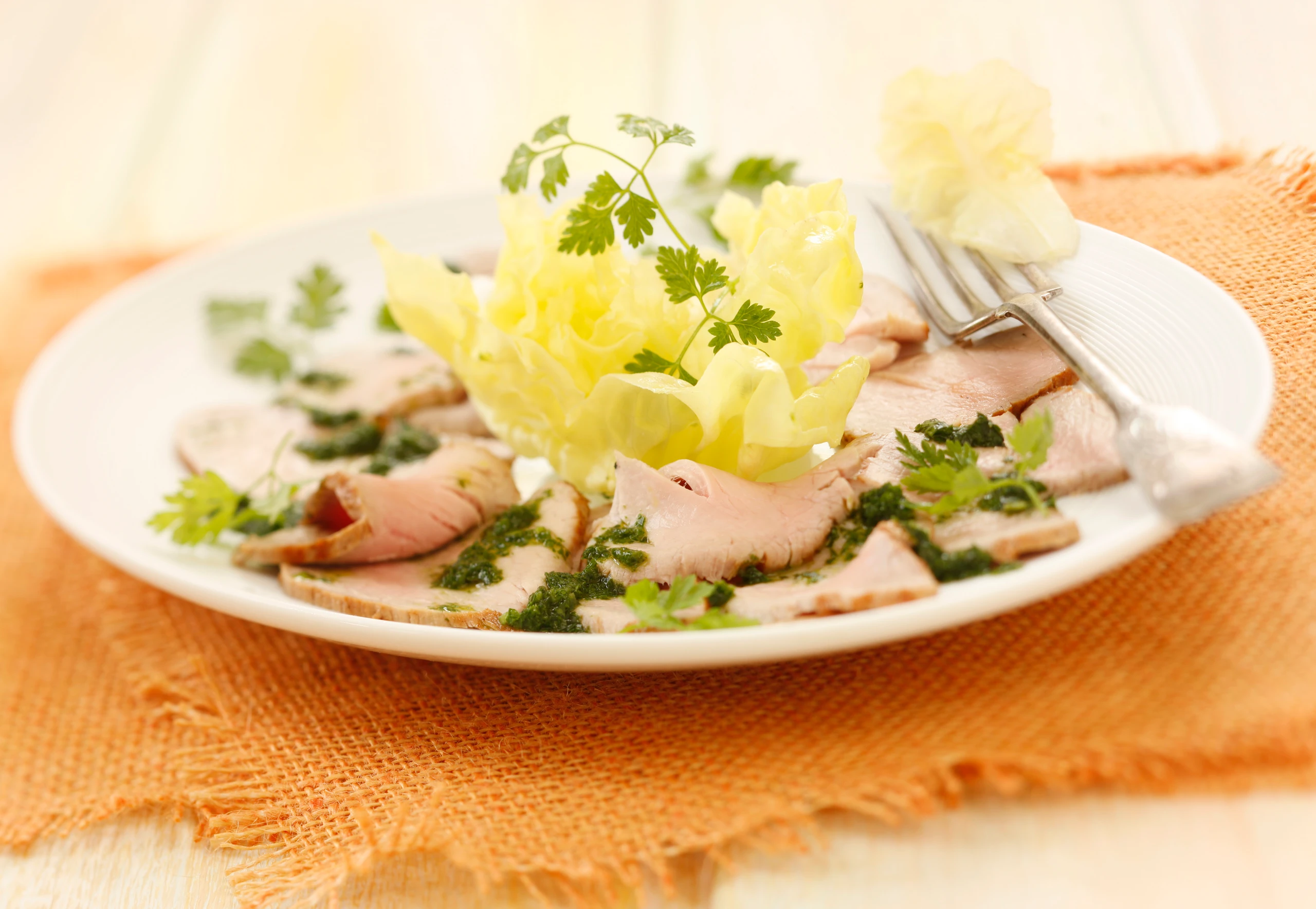 Filet in dünne Scheiben schneiden, mit Salsa dünn bestreichen, mit Salat und Kerbel garnieren.