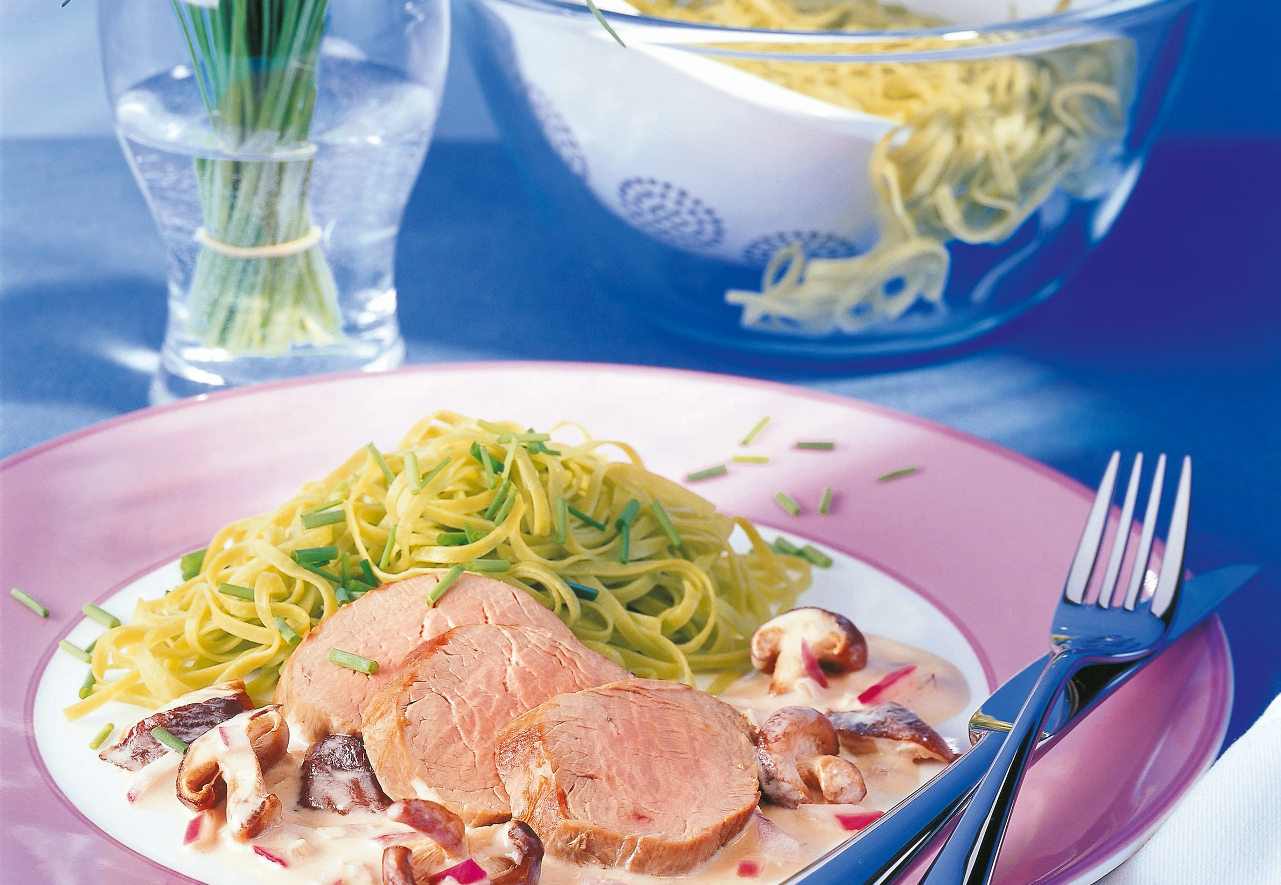 4/4Reichlich Salzwasser aufkochen und die Nudeln darin bissfest kochen. Abseihen, kurz heiß abspülen und abtropfen lassen. Nudeln in aufgeschäumter Butter oder Margarine schwenken und mit Salz und Pfeffer würzen. Schnittlauch untermischen.