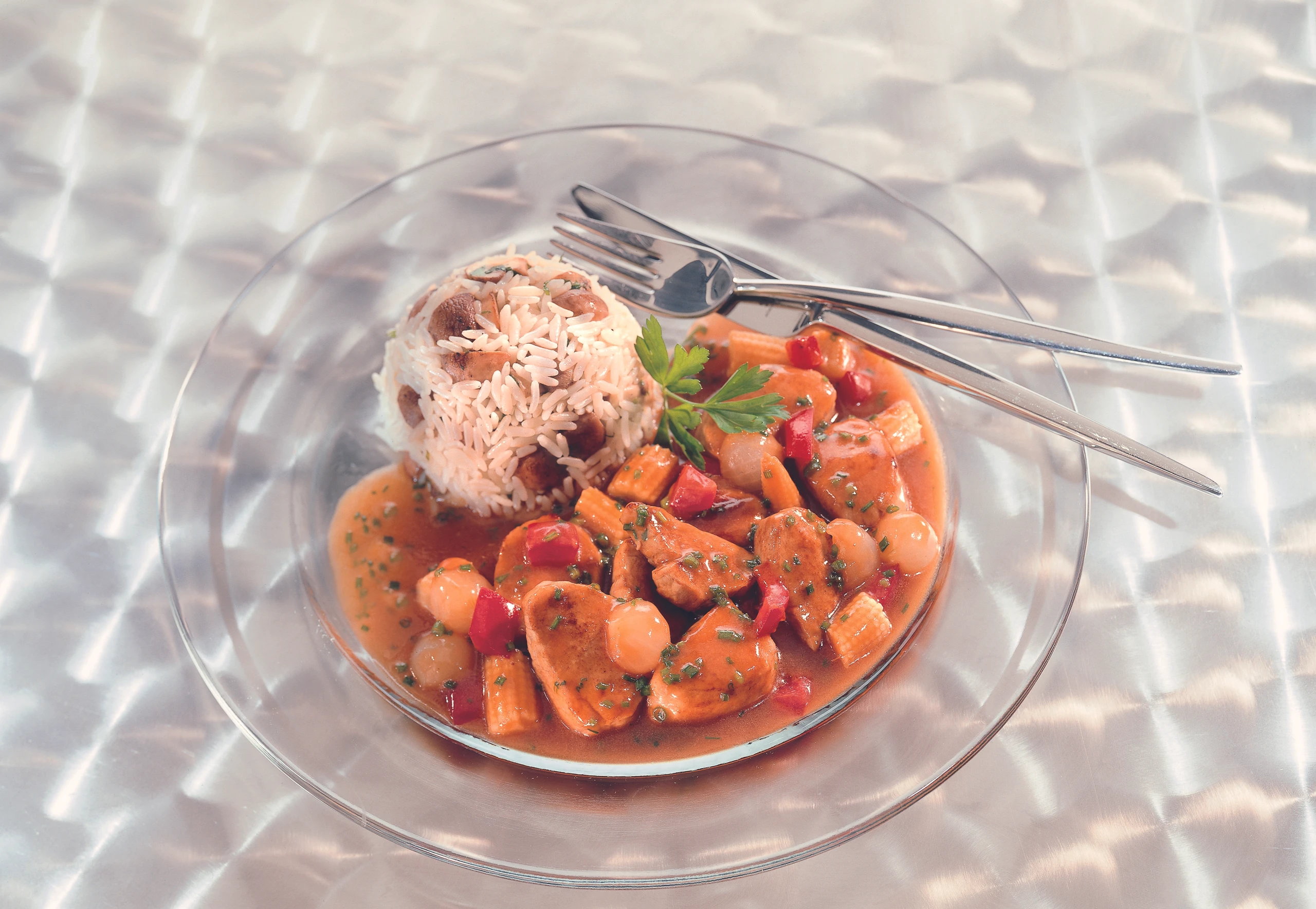 Schweinsfiletwürfel mit Biersauce und Schwammerlreis