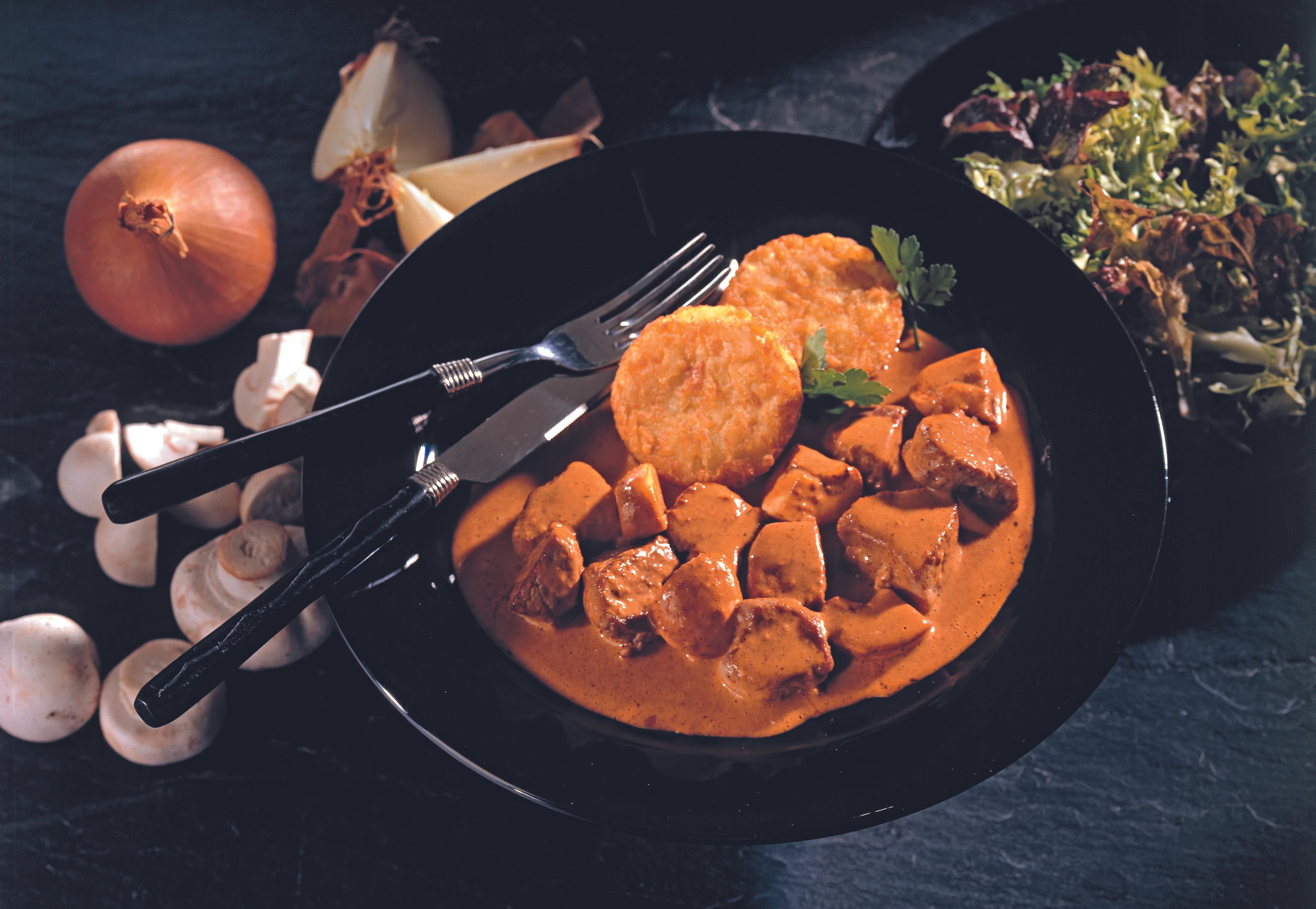 Fleisch in der Sauce kurz erwärmen. Geschnetzeltes mit Erdäpfel-Rösti anrichten.