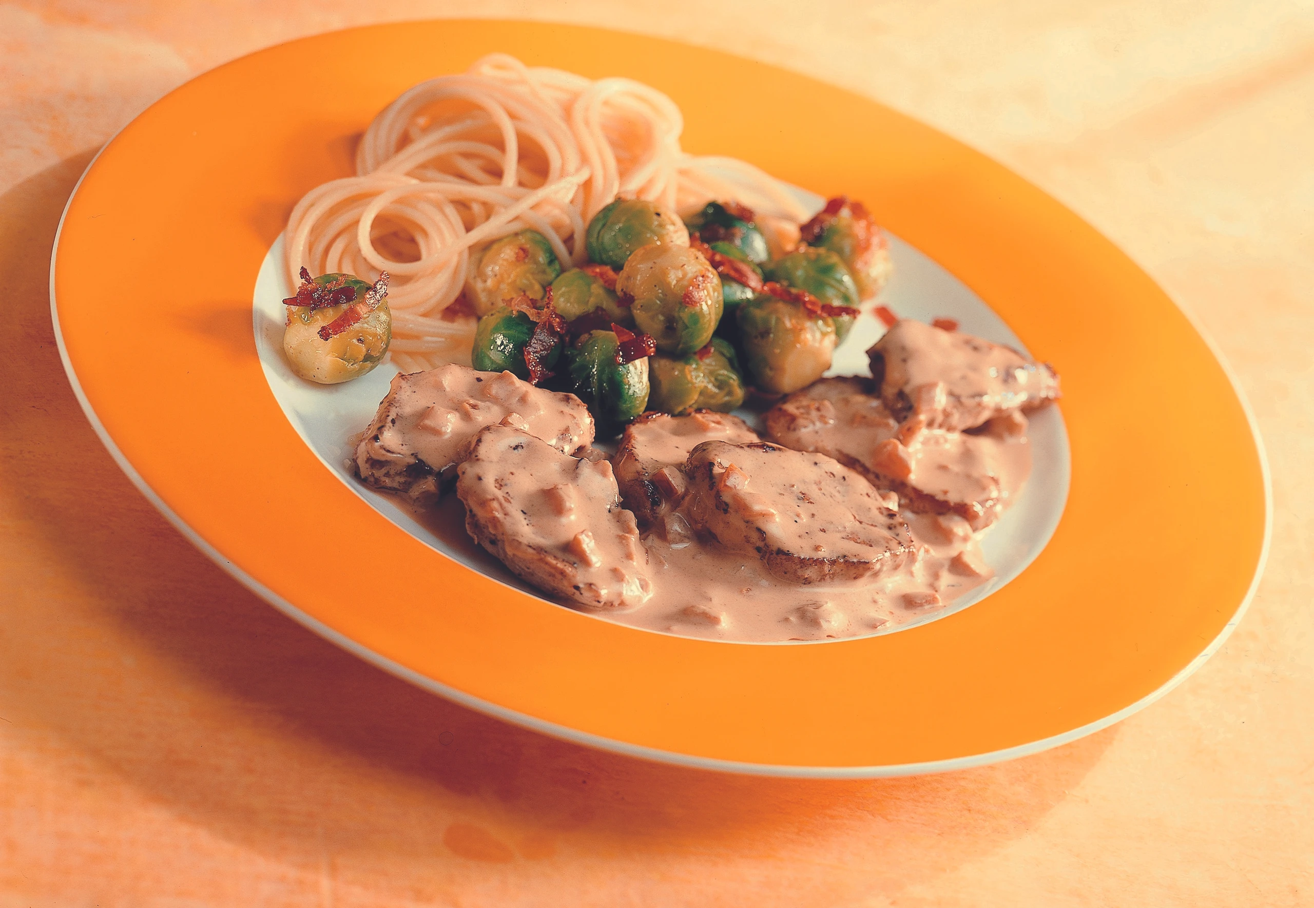 Schweinsgeschnetzeltes mit Zwiebelsauce und Speck-Kohlsprossen