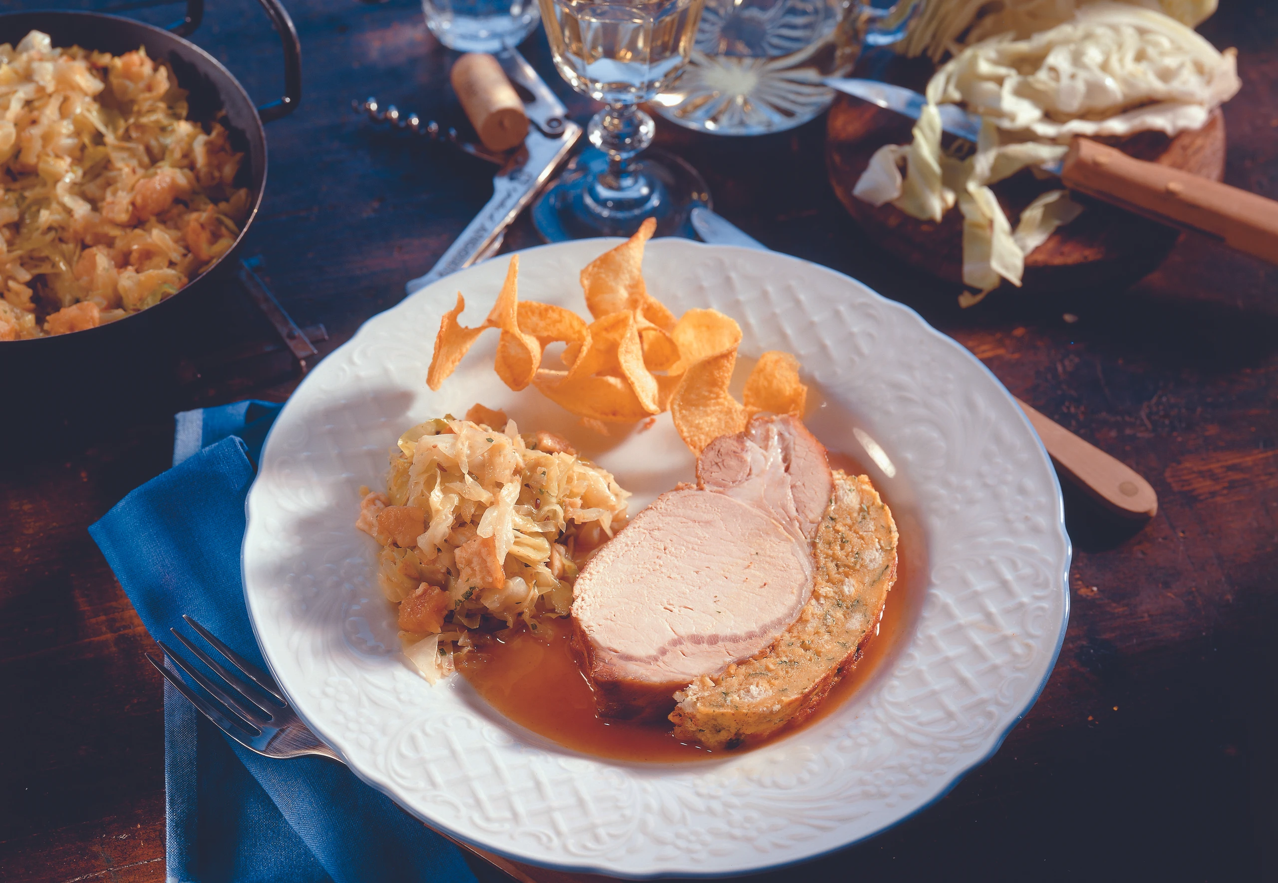 Schweinskarree mit Brotkruste, Erdäpfelspiralen und Grammelkraut