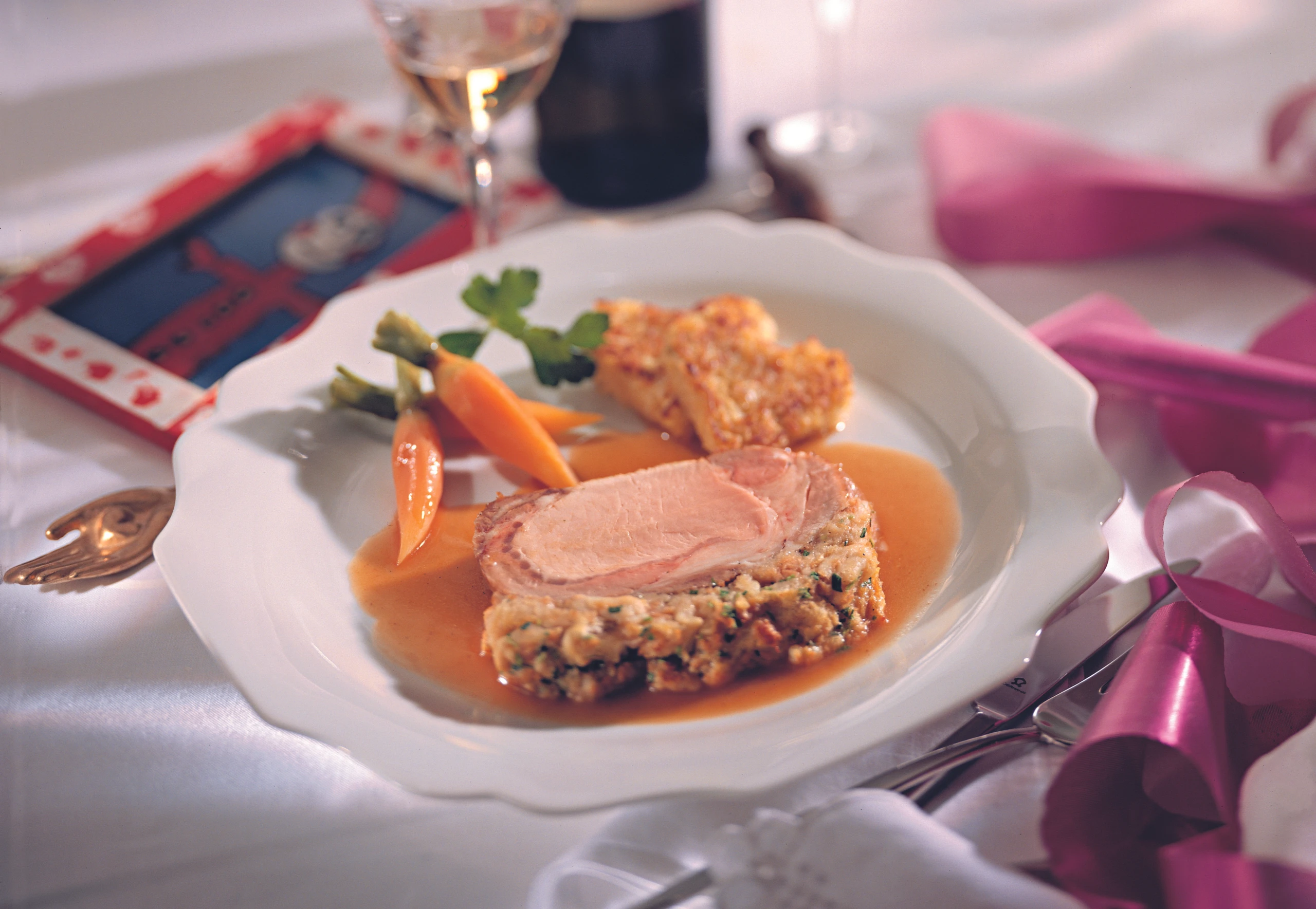 Schweinskarree mit Semmelkruste und Kraut-Krapferln