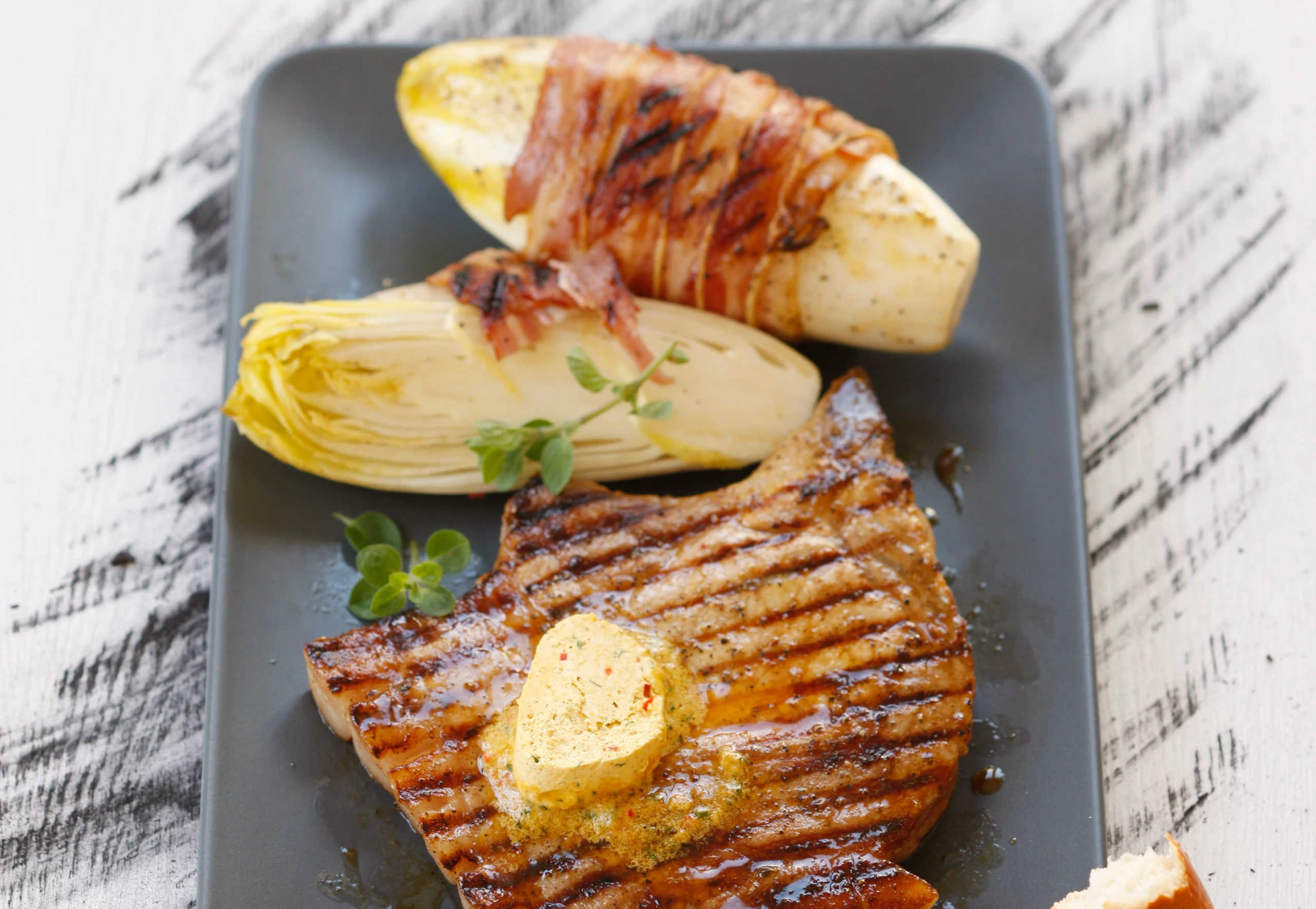 Schweinskotelett in Honigmarinade mit Speck-Chicorée