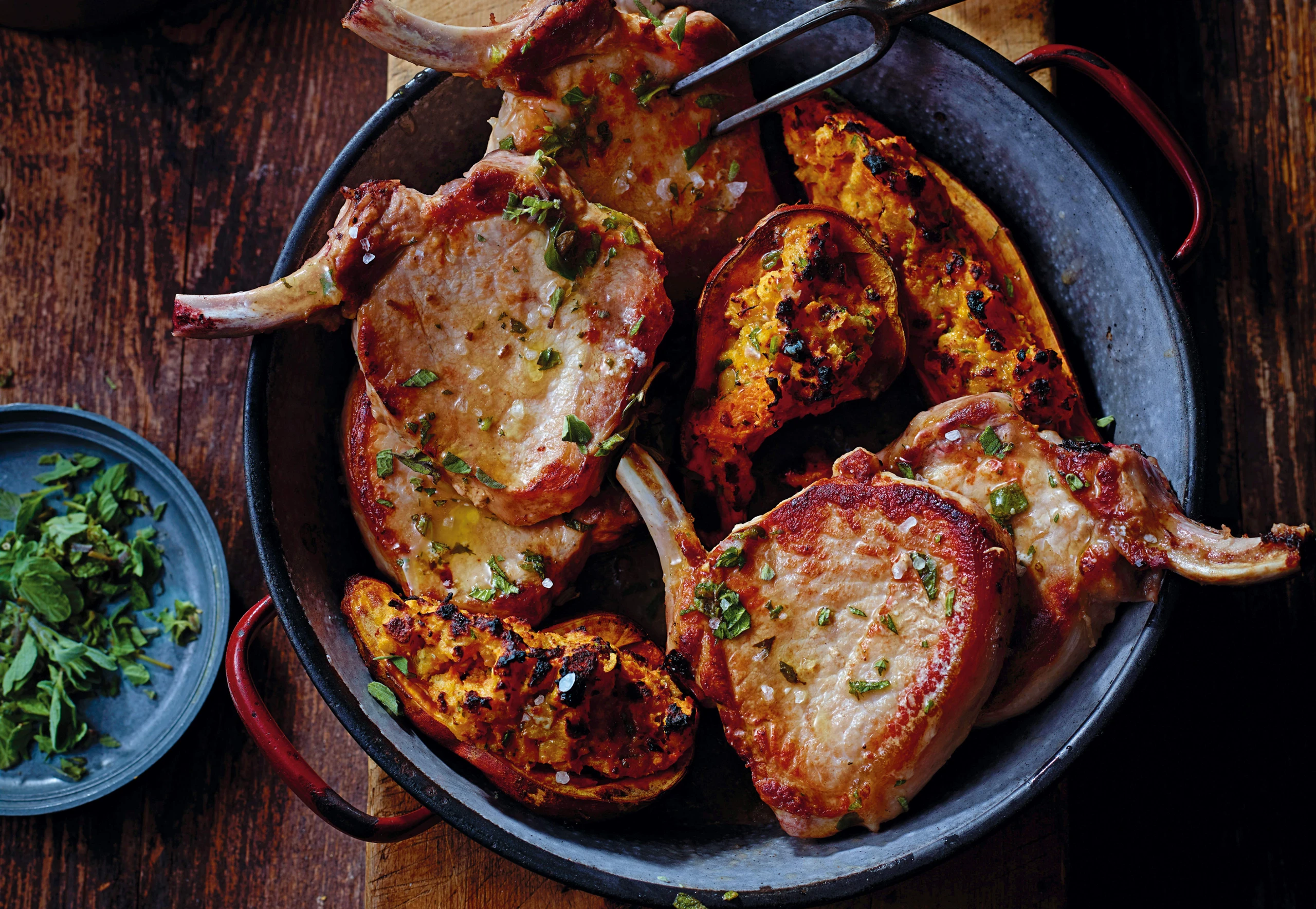 Schweinskotelett mit Oreganosafterl und gefüllten Süßkartoffeln