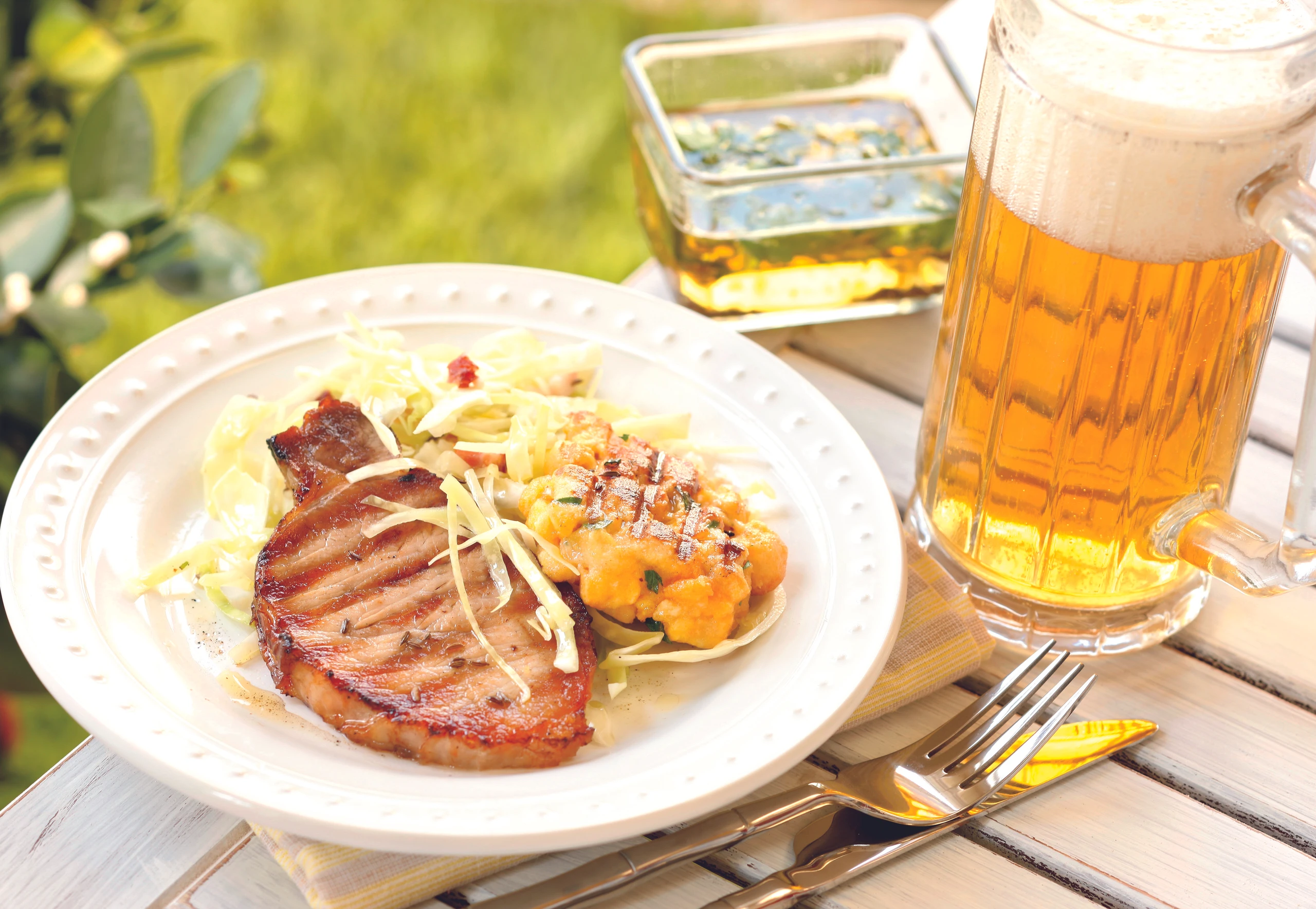 Koteletts aus der Marinade heben, abtropfen lassen und auf dem heißen Grill 8 Minuten garen – nach halber Garzeit wenden. Koteletts mit den Beilagen anrichten.