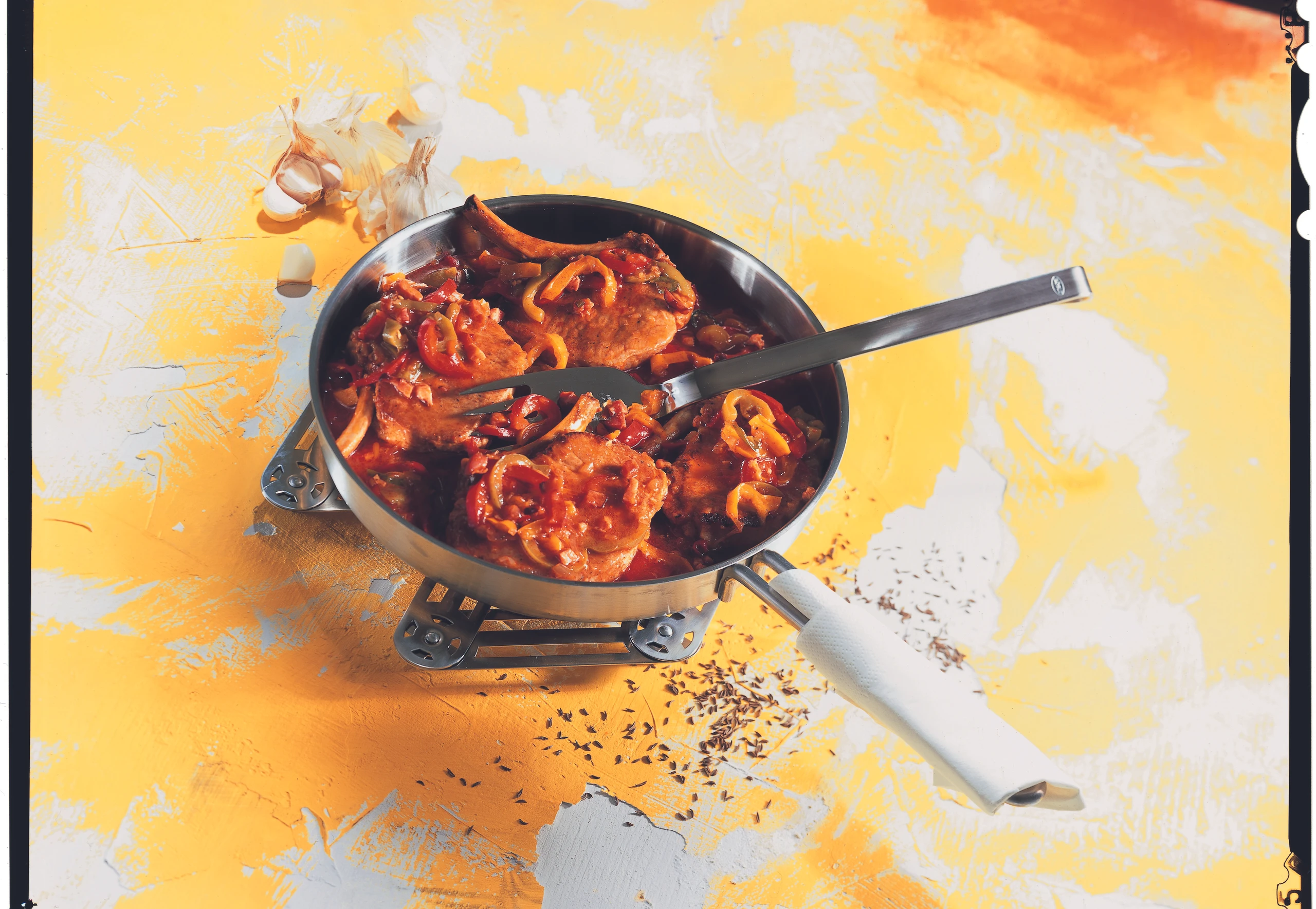 - Koteletts aus der Pfanne heben und beiseite stellen. Maistärke mit etwas Wasser glatt rühren, in das Letscho gießen und aufkochen. Fleisch einlegen und darin erwärmen. Koteletts mit dem Letscho und den Braterdäpfeln anrichten.