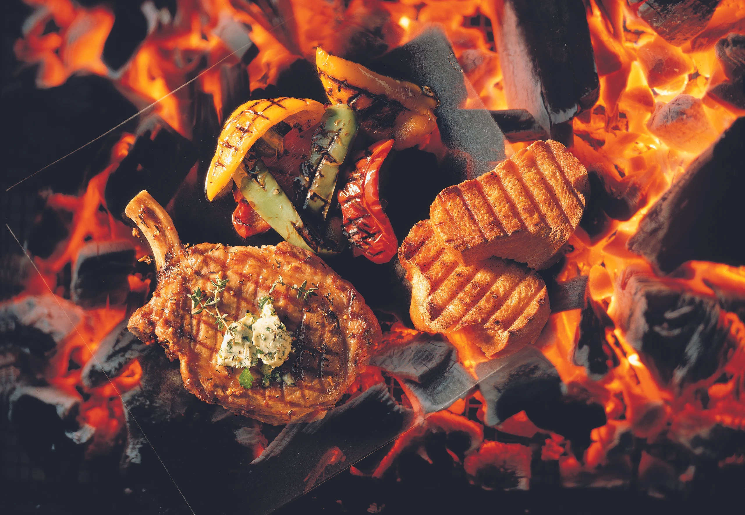 Gegrillte Schweinskoteletts mit Knoblauch-Thymian-Marinade und Kräuterbutter
