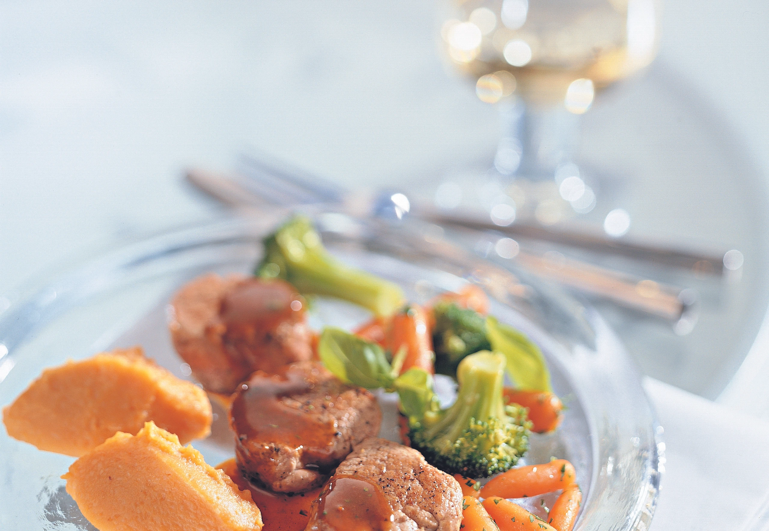 Schweinsmedaillons mit Basilikumsauce und Kürbispüree