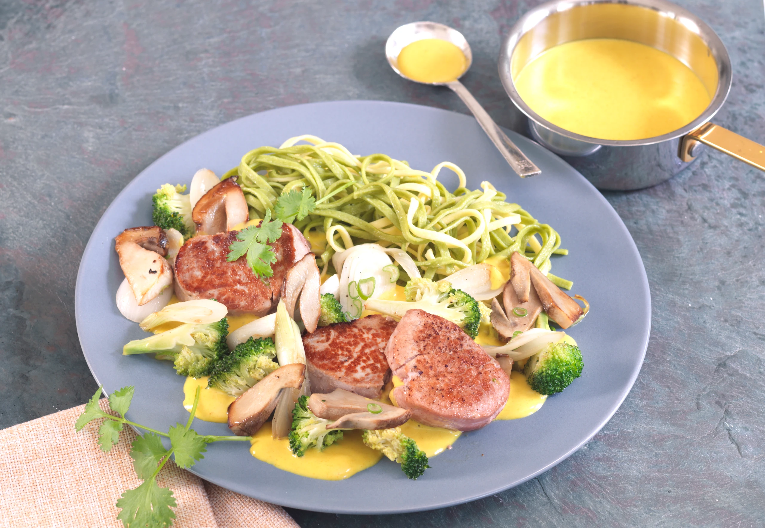 Brokkoli in Röschen teilen. Jungzwiebeln und Pilze putzen und in ca. 0,5 cm breite Scheiben schneiden. Fleisch in ca. 1,5 cm dicke Medaillons schneiden, salzen, pfeffern und in der Hälfte vom Öl beidseitig braten. Aus der Pfanne nehmen und warm stellen.