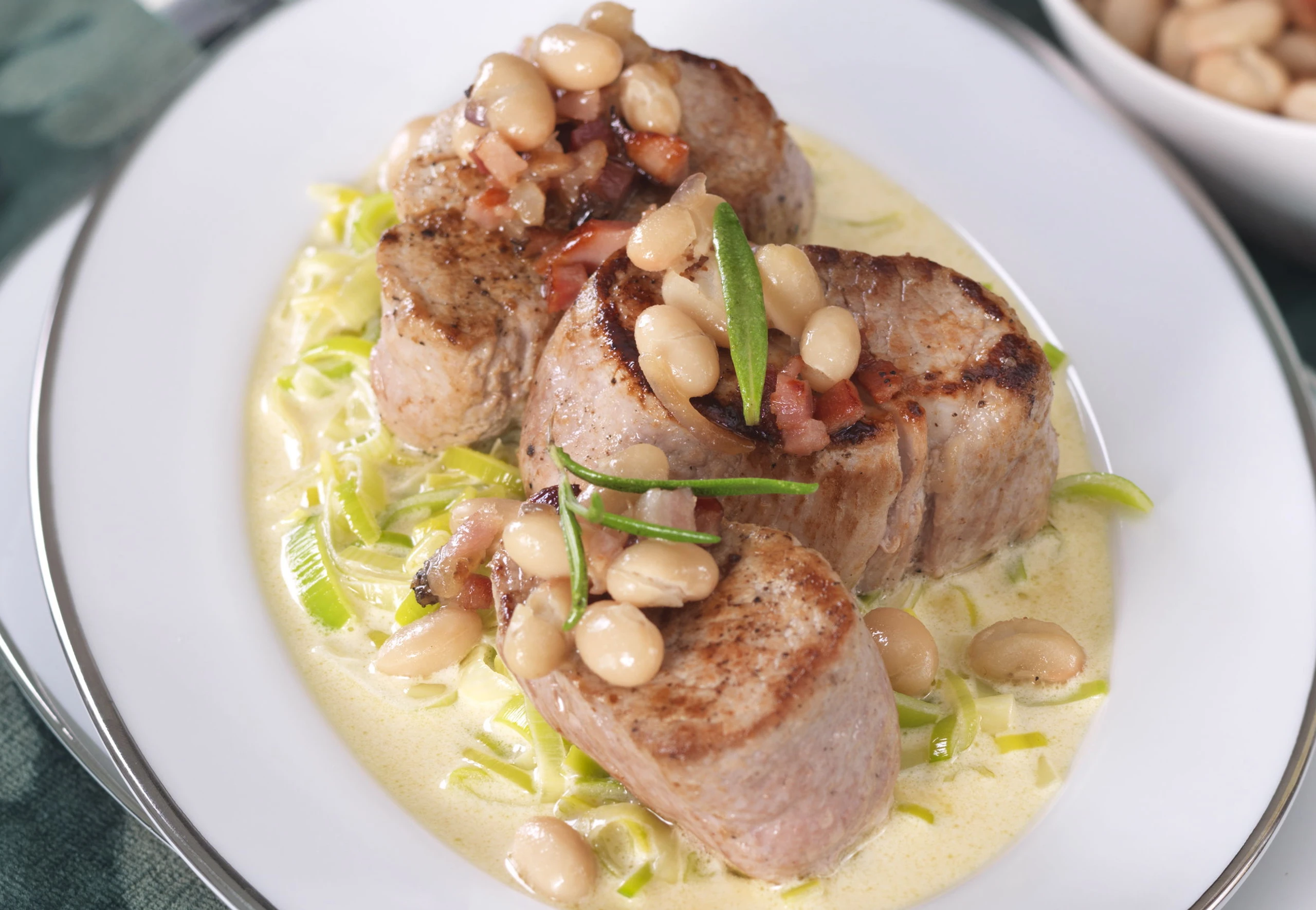 Schweinsmedaillons mit Lauch und Speckbohnen