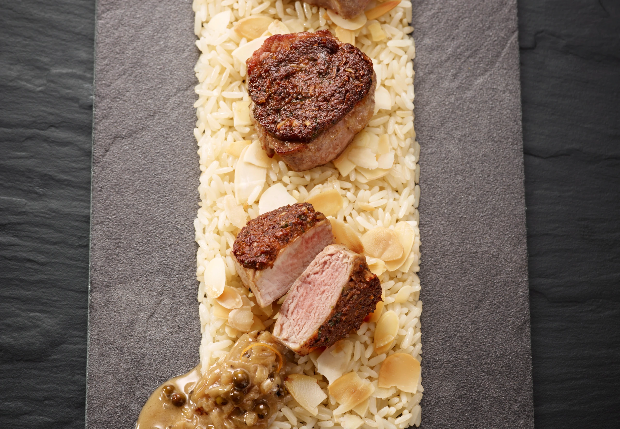 Schweinsmedaillons mit Pilzkruste und Pfeffersauce