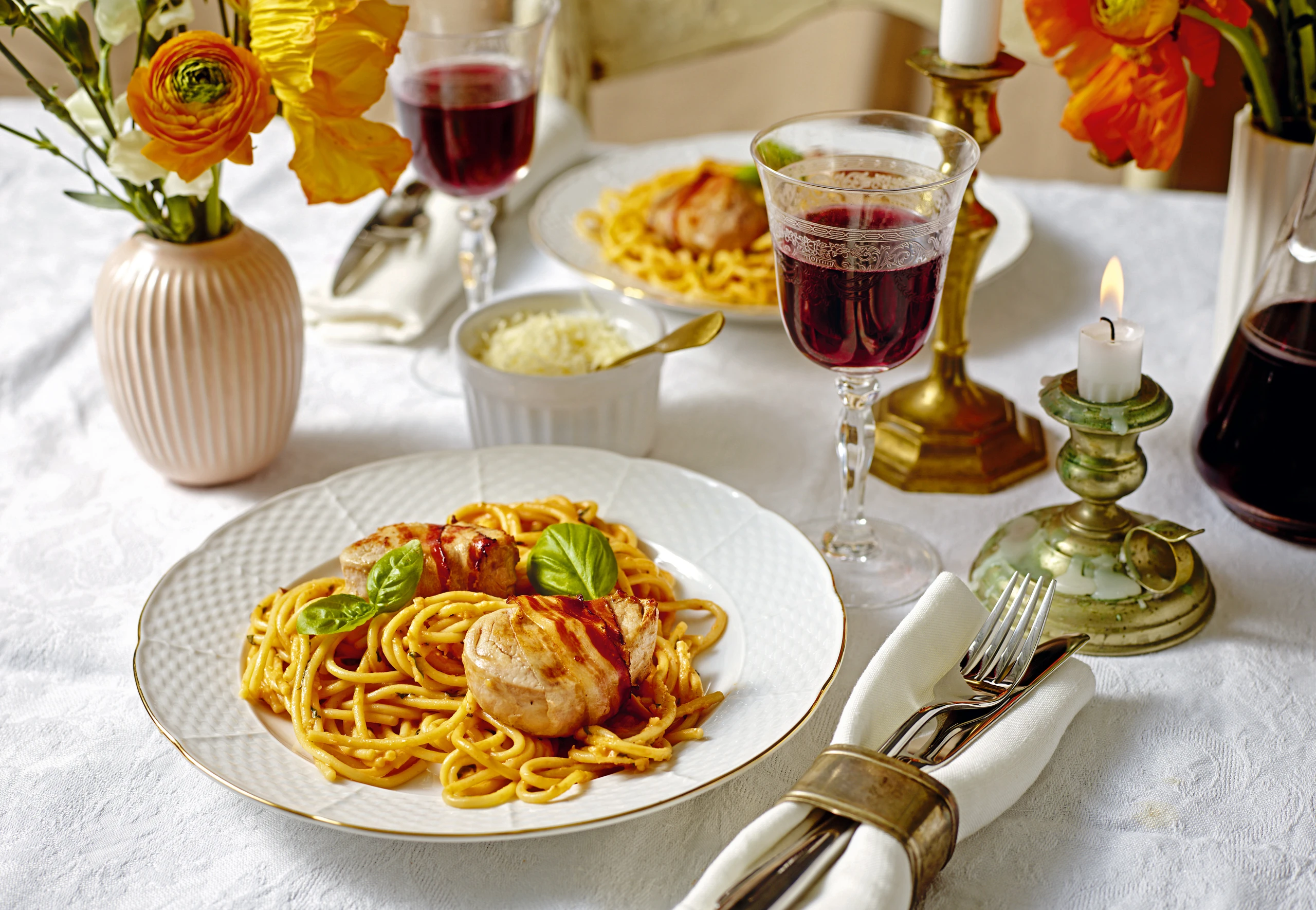 Schweinsmedaillons im Speckmantel mit Paradeis-Champignonpasta