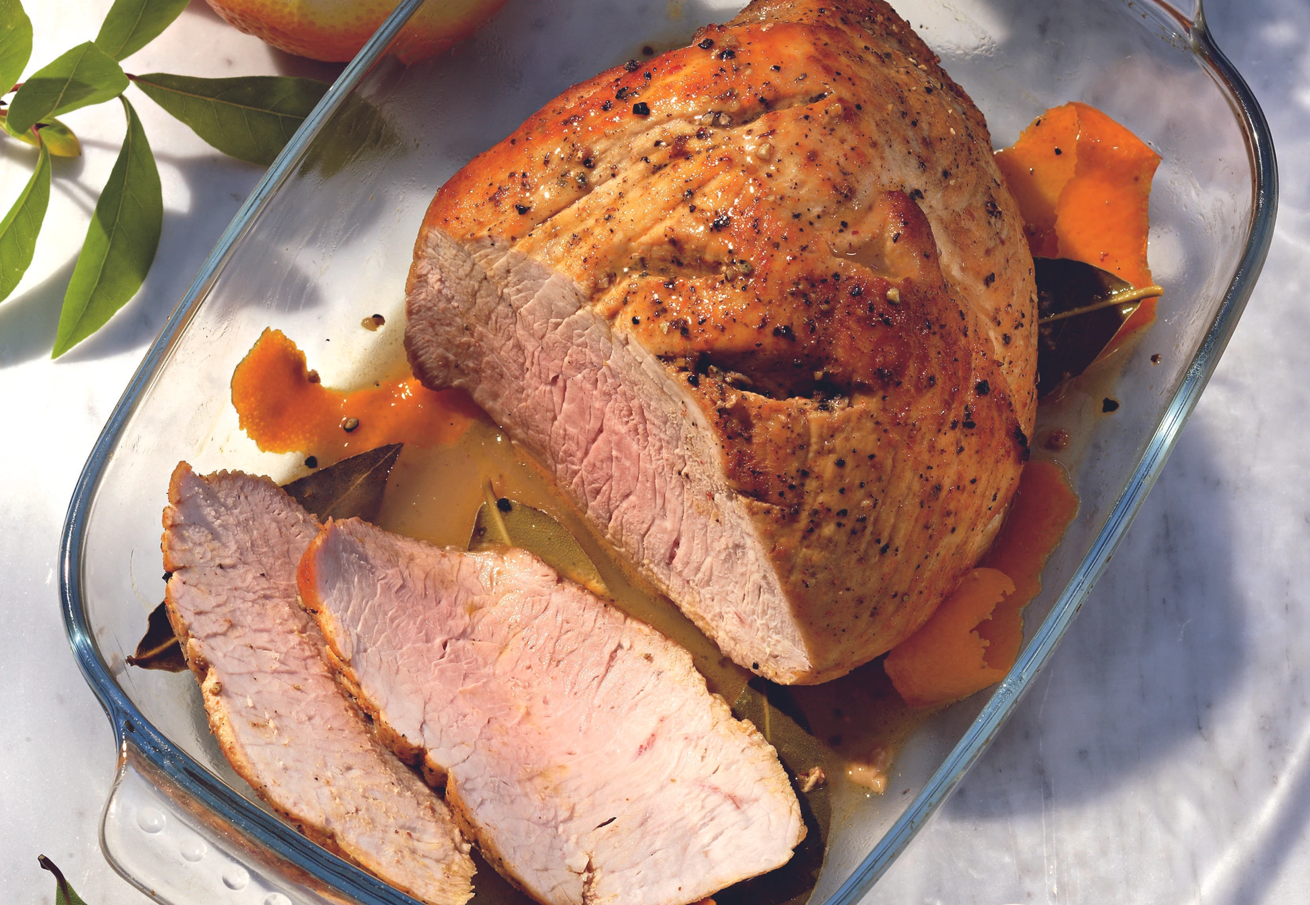 - Fleisch mit einem schmalen Messer 5 Mal nicht zu tief einstechen. Lorbeerblätter hineinstecken. Orangenschale in Streifen abheben. Fleisch mit Pfeffer und Orangenschale einreiben, mit Orangensaft und Öl übergießen, zugedeckt 10 Stunden ziehen lassen.