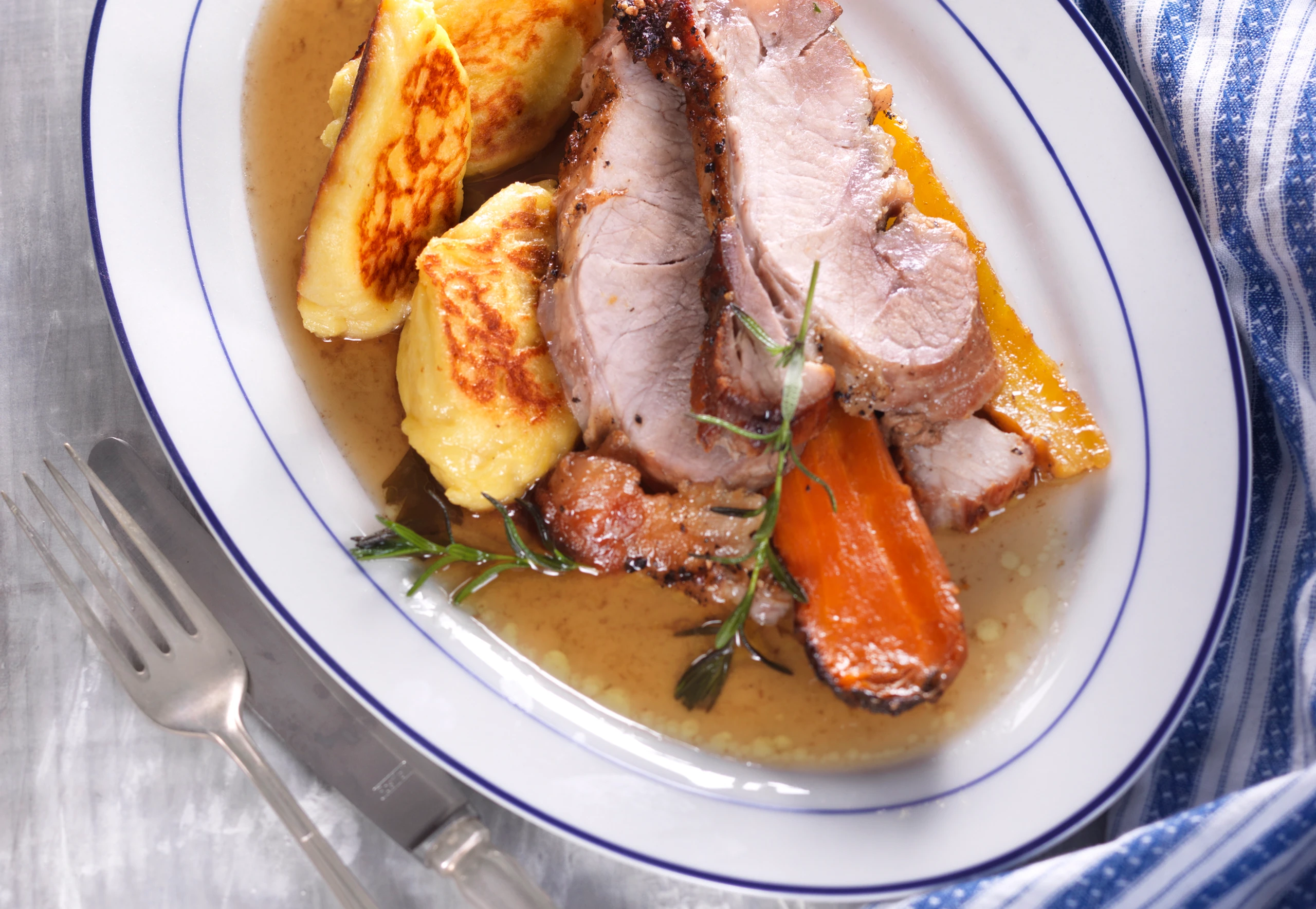 Braten und Wurzelgemüse herausnehmen und warm stellen. Bratensaft und Zwiebeln durch ein Sieb drücken, mit Salz abschmecken. Eventuell mit Speisestärke eindicken. Braten portionieren, mit Gemüse, Saft und Erdäpfelkrapferln servieren.