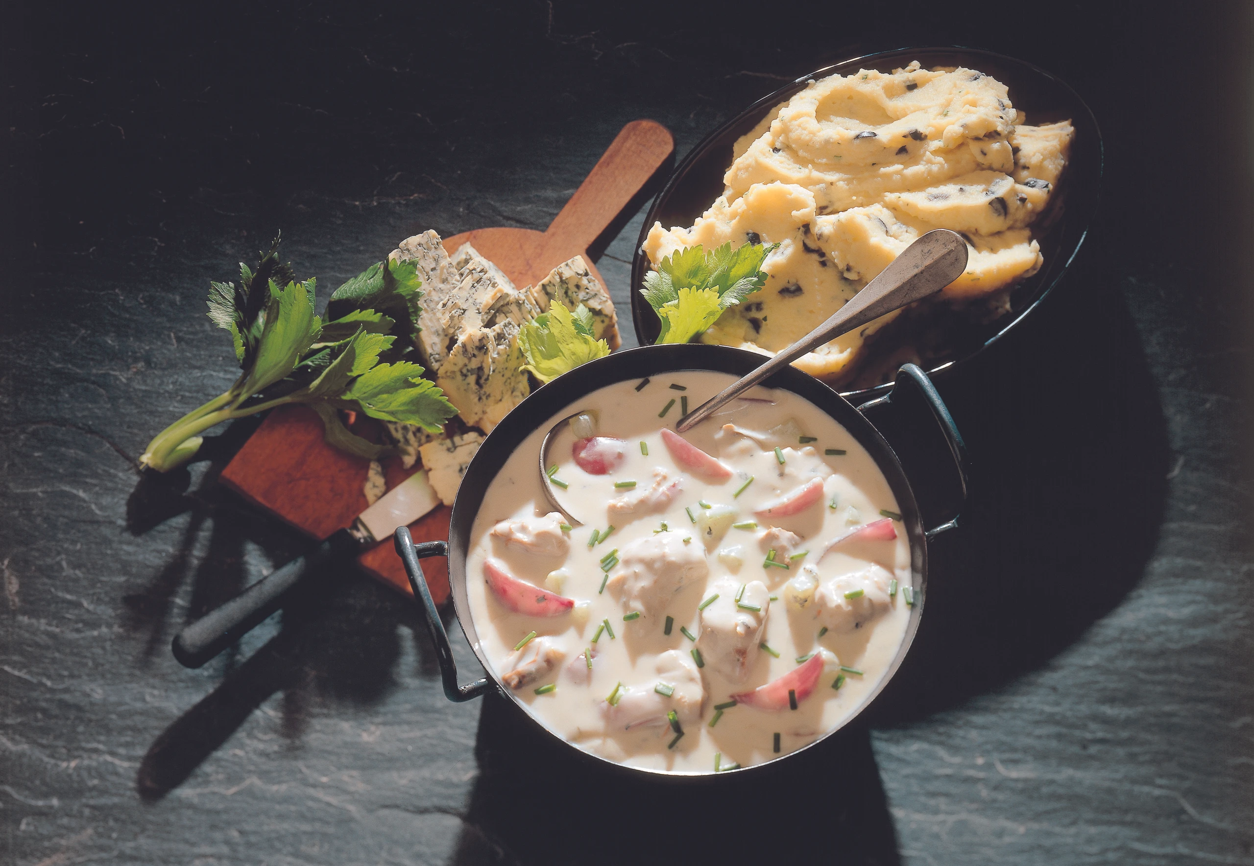 Schweinsragout mit Blauschimmelkäsesauce und Oliven-Selleriepüree