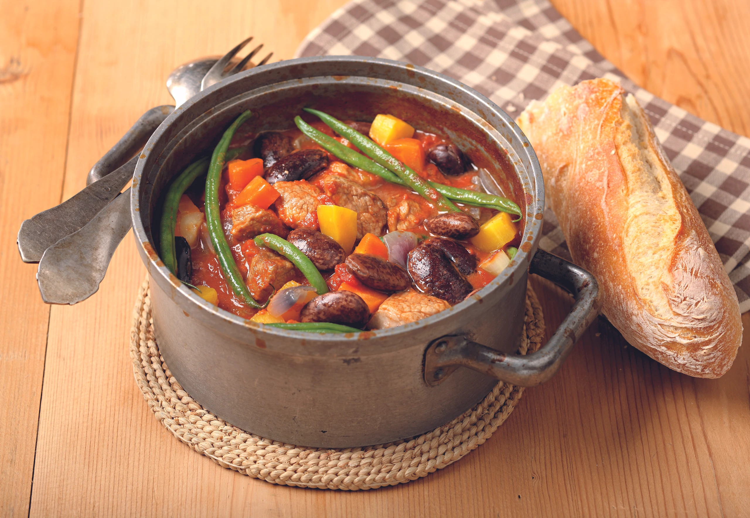 Käferbohnen abtropfen lassen. Fisolen putzen und nach 1 Stunde Garzeit unter das Ragout mischen. Am Ende der Garzeit Käferbohnen und Thymian unterrühren. Ragout kurz durchziehen lassen, anrichten und mit Baguette servieren.