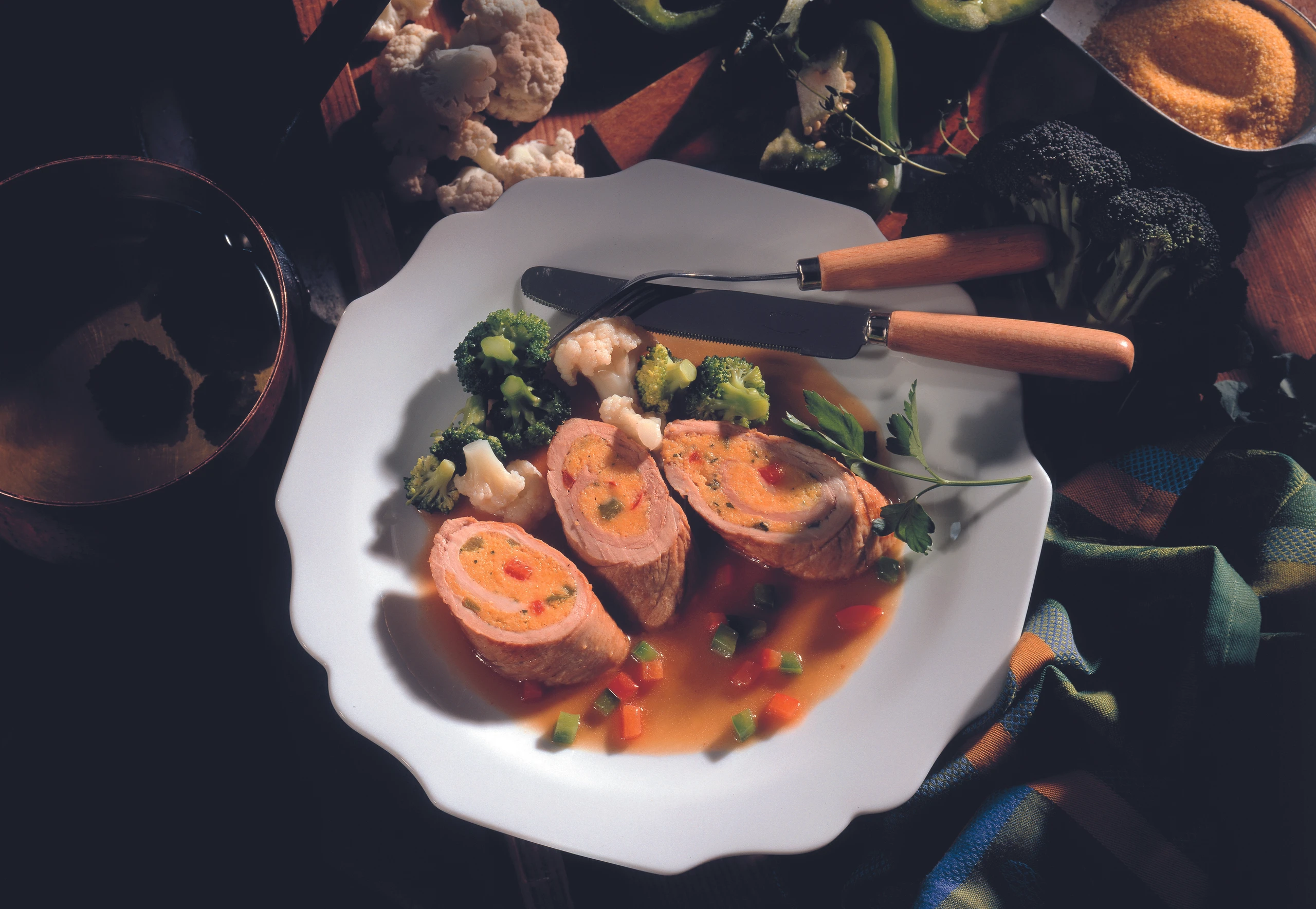 Fleisch zwischen Frischhaltefolie behutsam klopfen und beidseitig mit Salz, Pfeffer und Kümmel würzen. Schnitzel zu zwei Dritteln mit Grießmasse bestreichen, straff einrollen und mit Spagat binden.