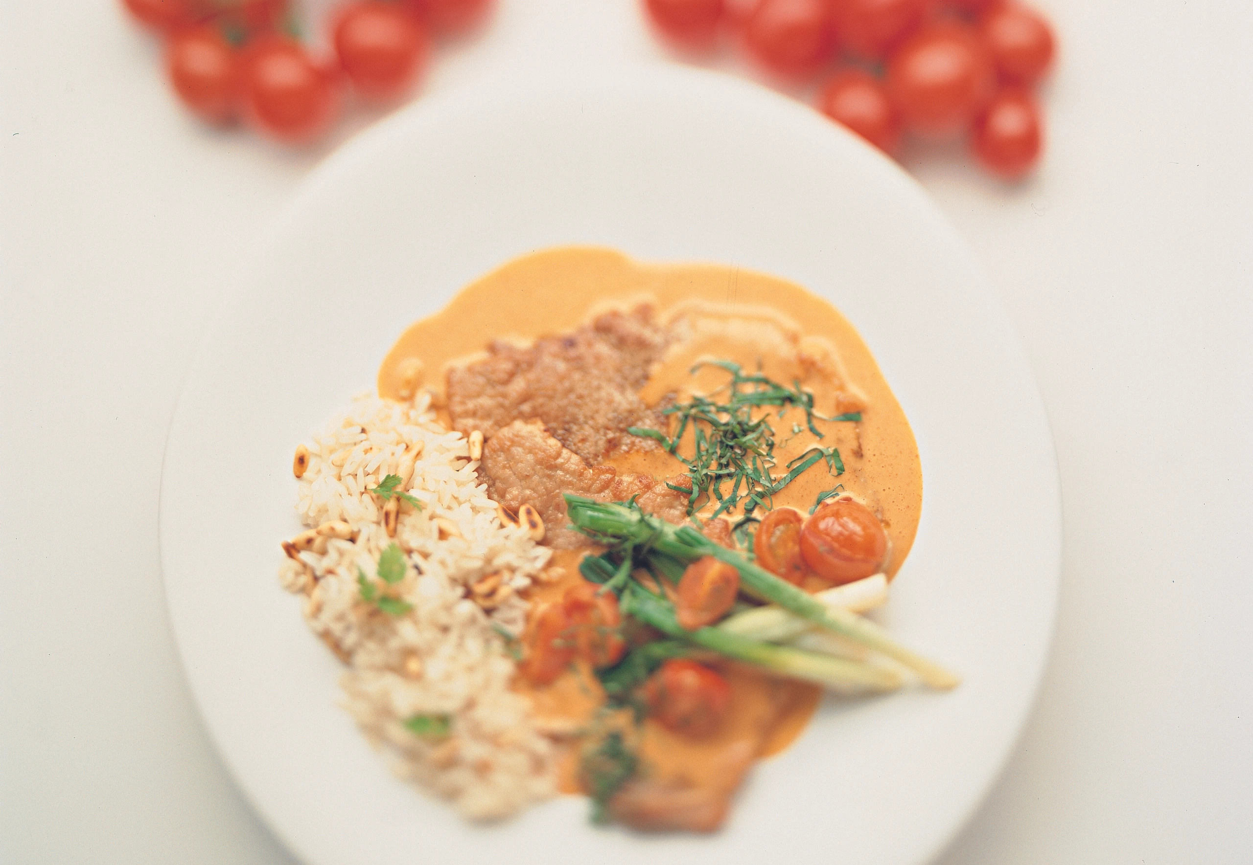 Schweinsschnitzel in Paradeiser-Lauchsauce mit Pignolireis