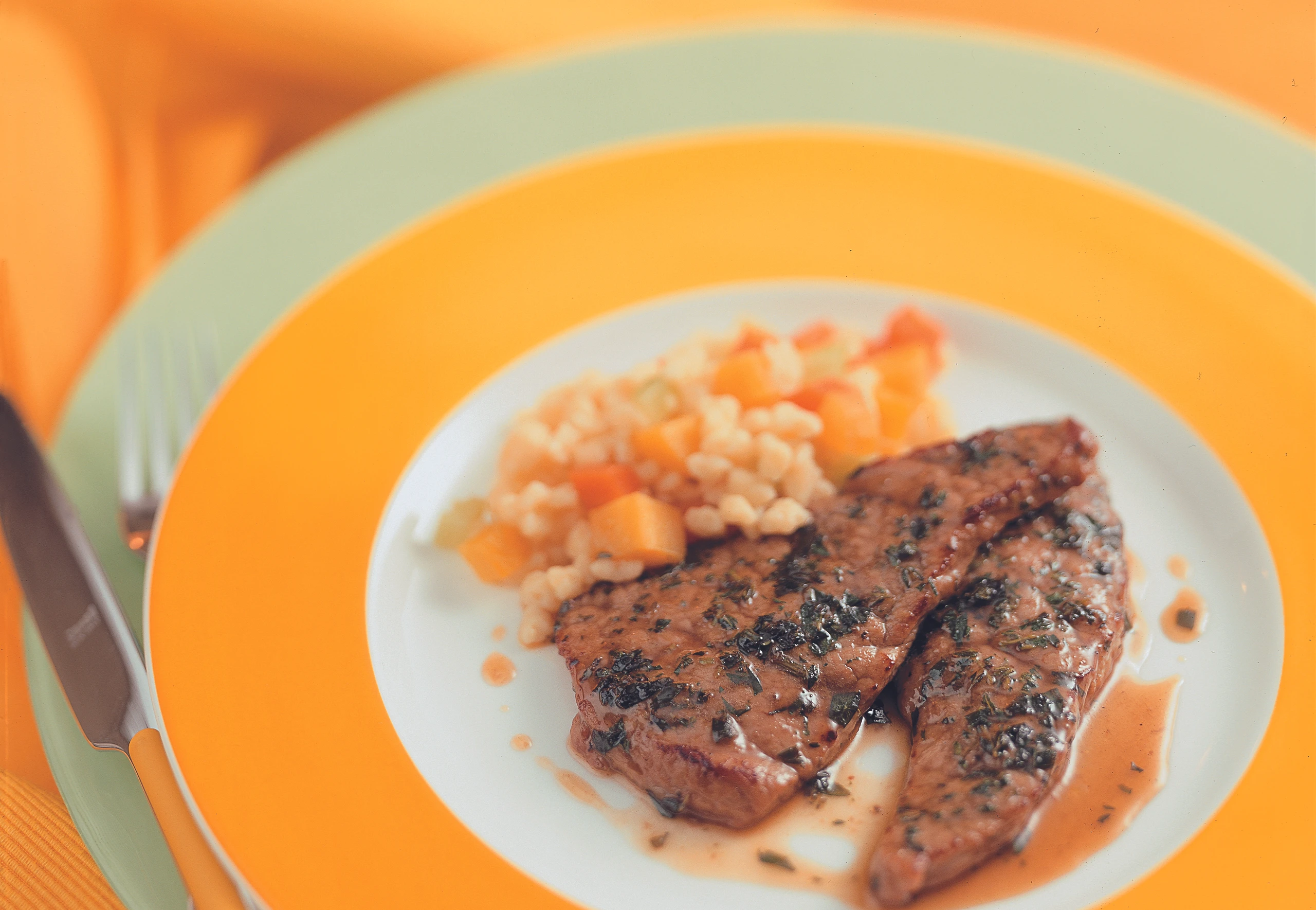 Schnitzel aus der Pfanne heben und mit Tarhonya (Meinrad Neunkirchner mischt Gemüse darunter) anrichten. Schnitzel vor dem Servieren mit dem Safterl beträufeln.