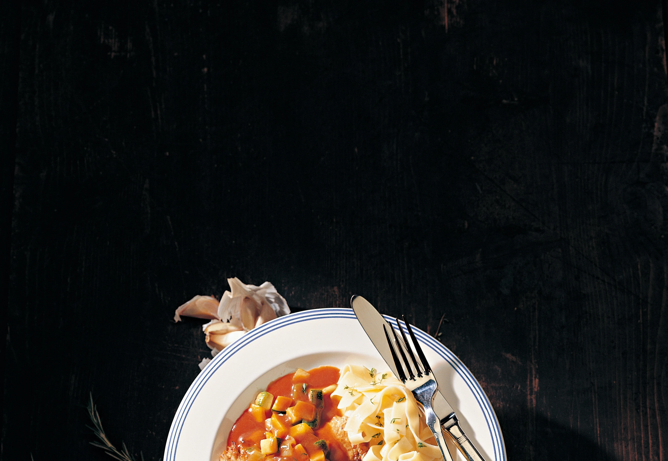 Im Bratrückstand Zucchini und Paprika nacheinander in wenig Öl anbraten und abtropfen lassen. Passierte Paradeiser und Bratensaft in die Pfanne gießen und aufkochen, Gemüse untermischen. Sauce mit Salz, Pfeffer, Thymian, Rosmarin, 1 MS Senf und zerdrücktem Knoblauch würzen und ca. 1 Minute köcheln. Schnitzel einlegen, in der Sauce erwärmen und anrichten. Dazu serviert man Nudeln oder Reis.