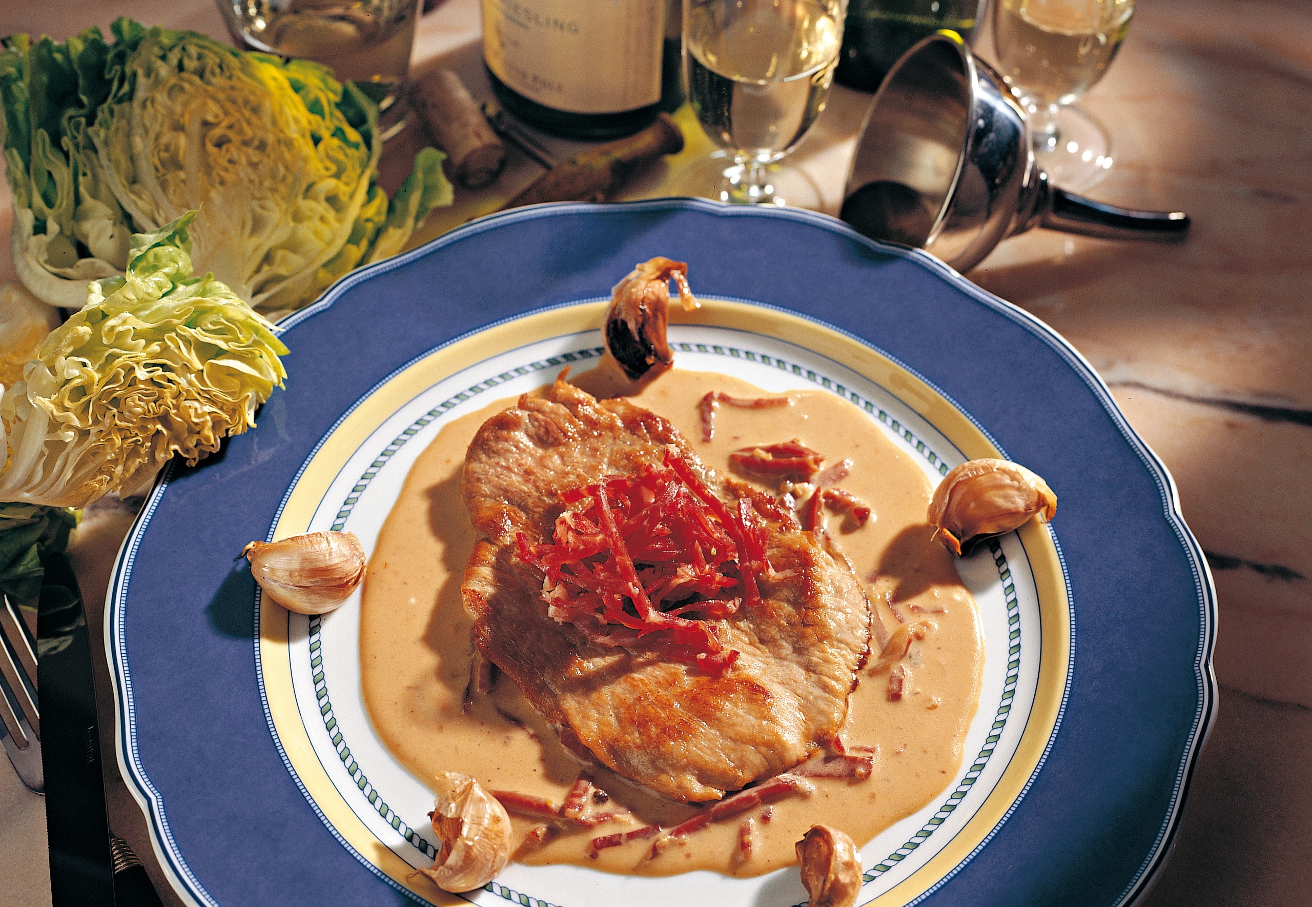Schweinsschnitzel mit Knoblauch, Rohschinken und Erdäpfel-Gnocchi