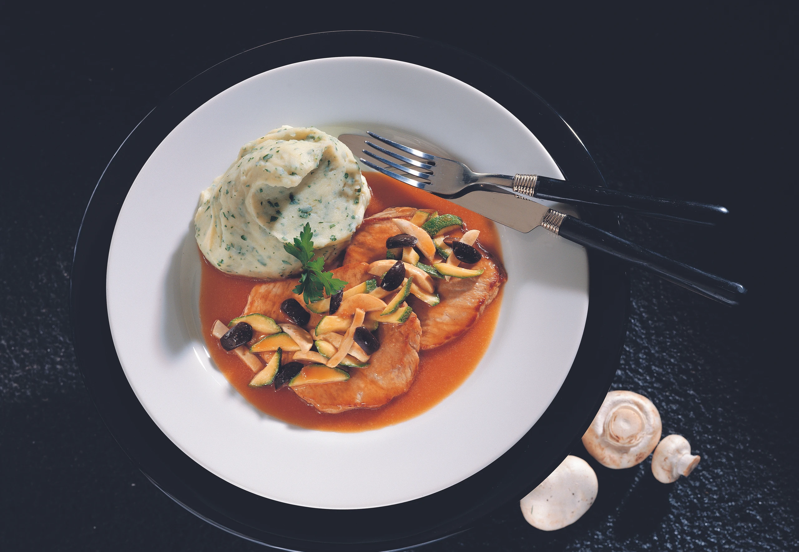 Im Bratrückstand Zwiebel, Champignons und Zucchini anschwitzen, Bier und Bratensaft zugießen. Sauce ca. 1 Minute köcheln, mit Salz, Pfeffer und zerdrücktem Knoblauch würzen. Schnitzel in die Sauce legen und ca. 1/2 Minute ziehen lassen. Schnitzel mit Kräuterpüree (siehe Rezept) anrichten.