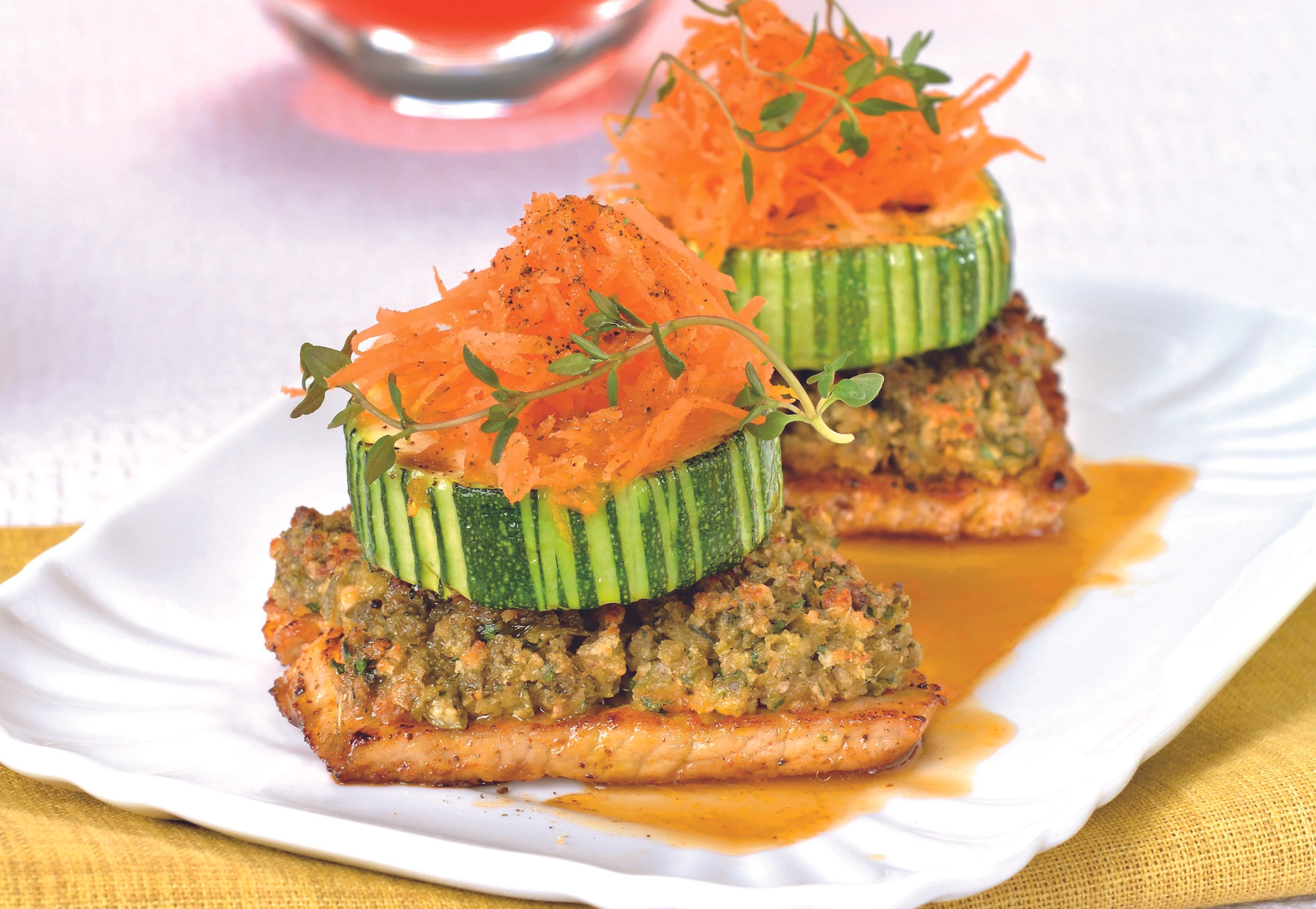 - Karotten schälen, fein reiben, mit Zitronensaft, restlichem Öl, Salz und Zucker abschmecken und auf den Zucchinischeiben verteilen.