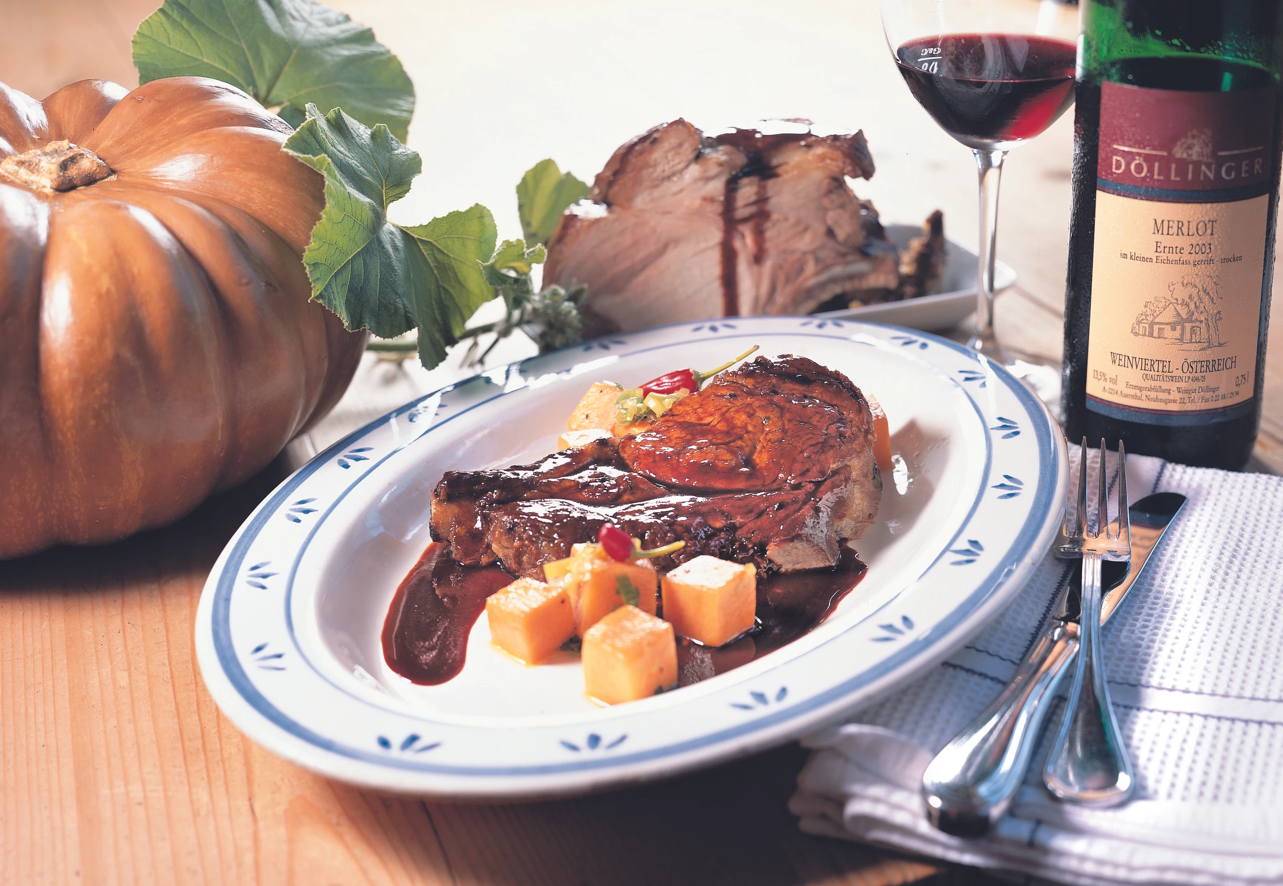 Schweinsschopf mit Rotwein-Chili-Sauce und Kürbisgemüse